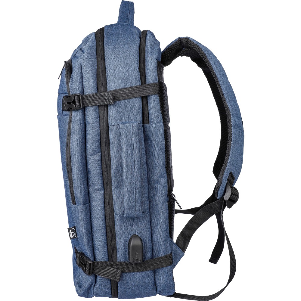 rPET polyester (300D) backpack and laptop bag (17 inch) with 210D lining inside. Cabin-proof. With carrying loop on top and sides. Velcro laptop compartment, anti-theft pocket, and two large zippered compartments. Ventilated padded backing, trolley strap, closing buckles, and USB-A port on the side. With side buckles to keep the luggage compact. Carrying weight approx. 12 kg. Includes rPET label.