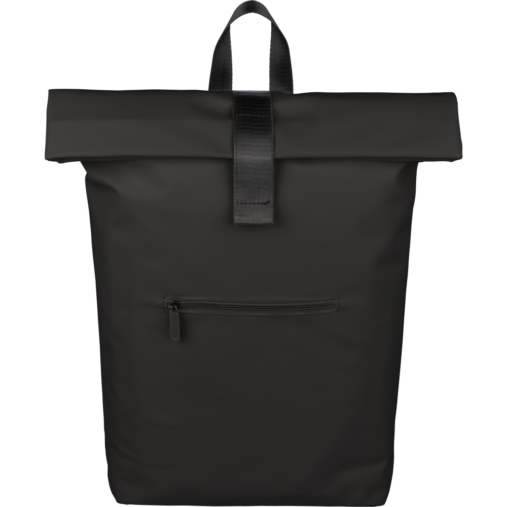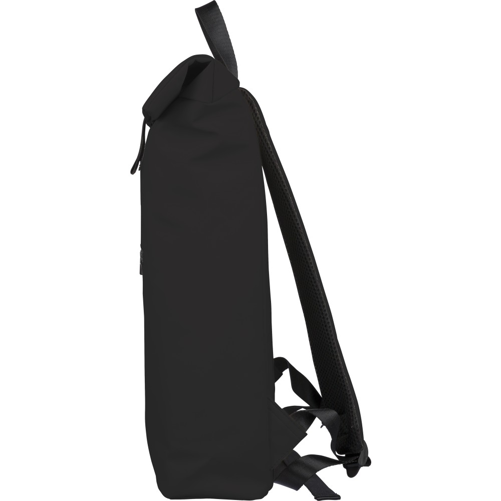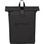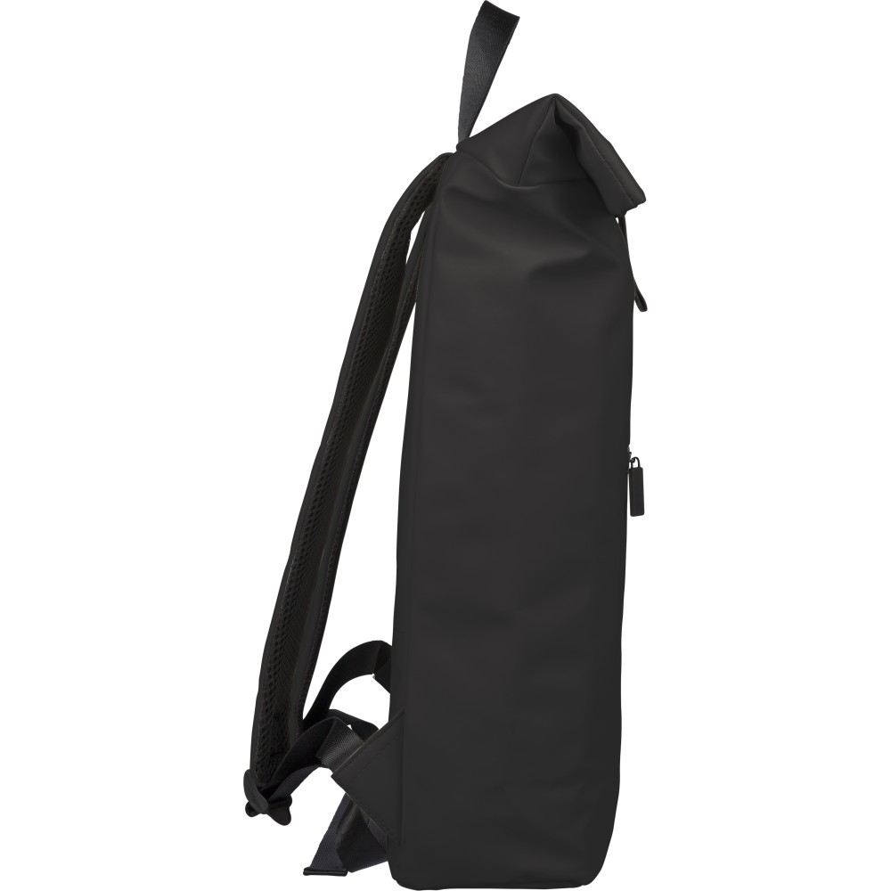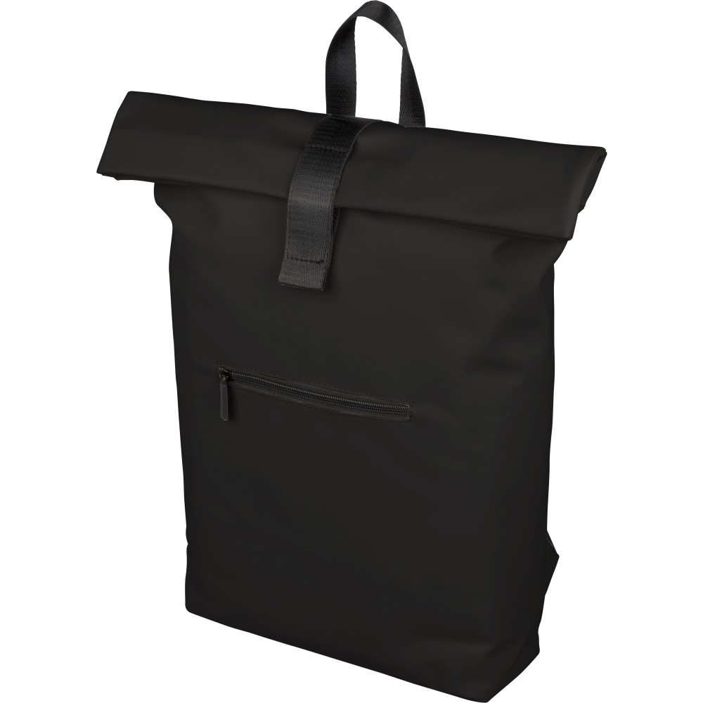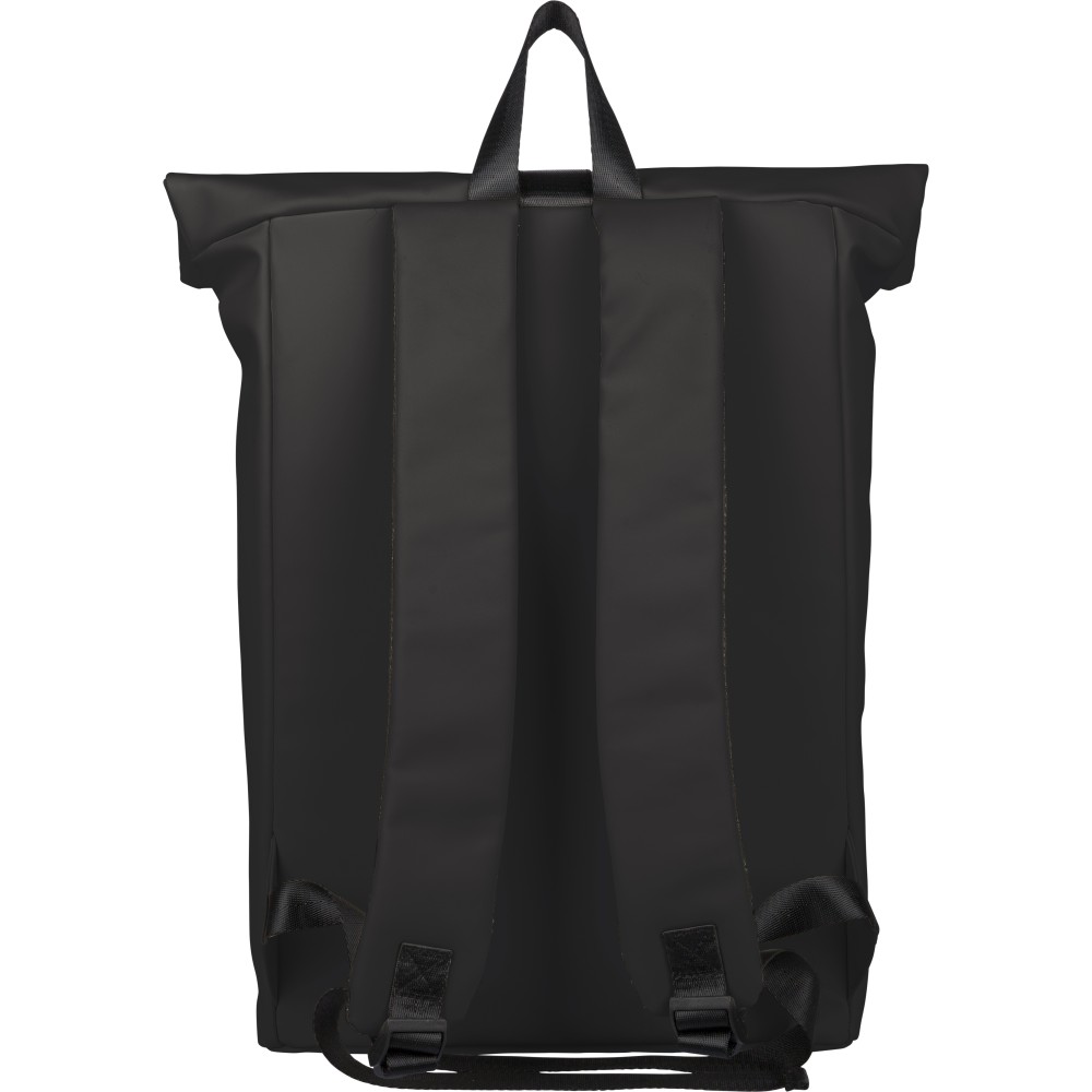 Recycled PU backpack (19 l) with rolltop closure and velcro strip. Features front zip pocket, 16? laptop compartment, 210D recycled lining, adjustable ventilated shoulder straps, top handle, and single recycled label inside.