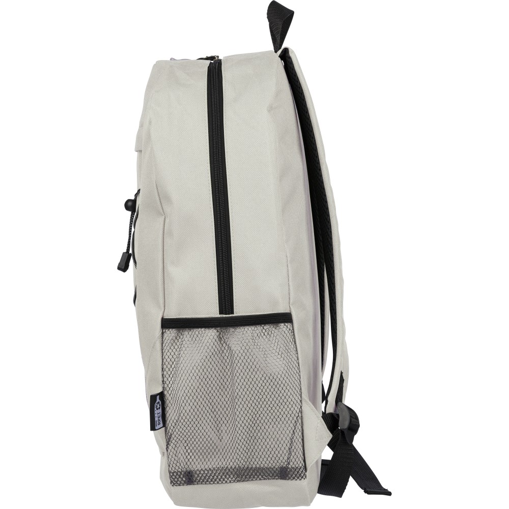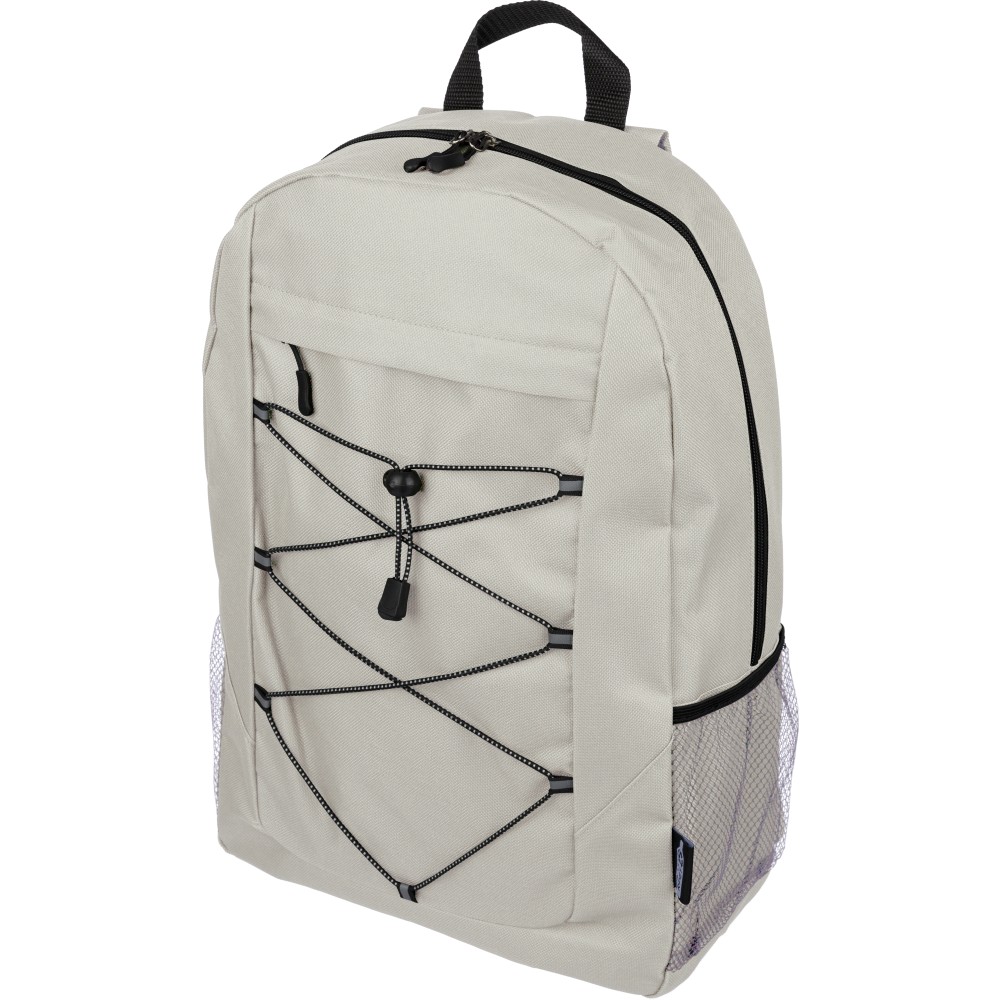 rPET polyester 600D adventure backpack with drawstring closure and large zippered main compartment. Features mesh side pockets, elastic front bands, small front zip pocket for decoration, adjustable straps, and rPET label.