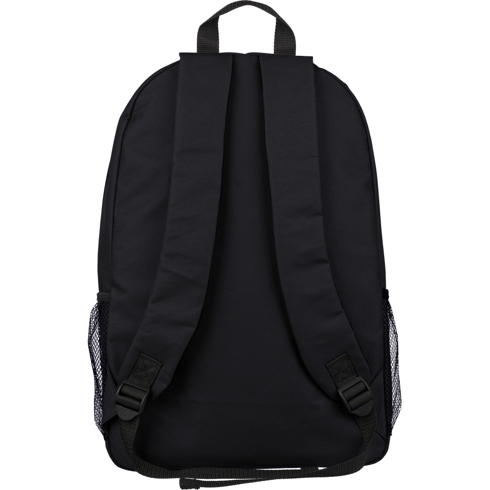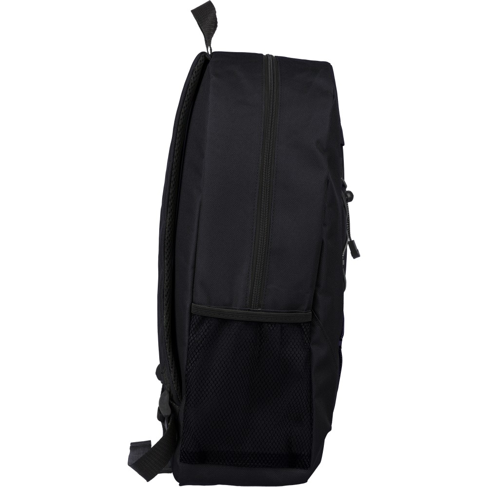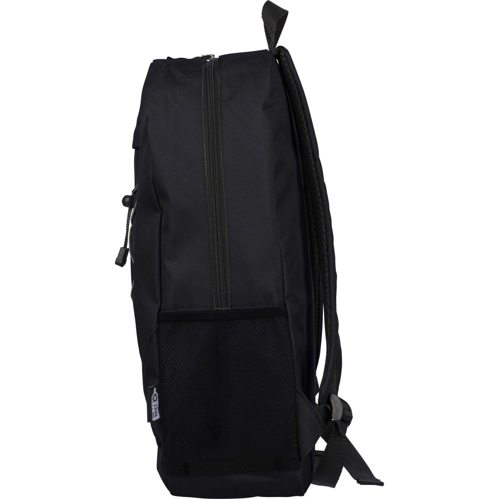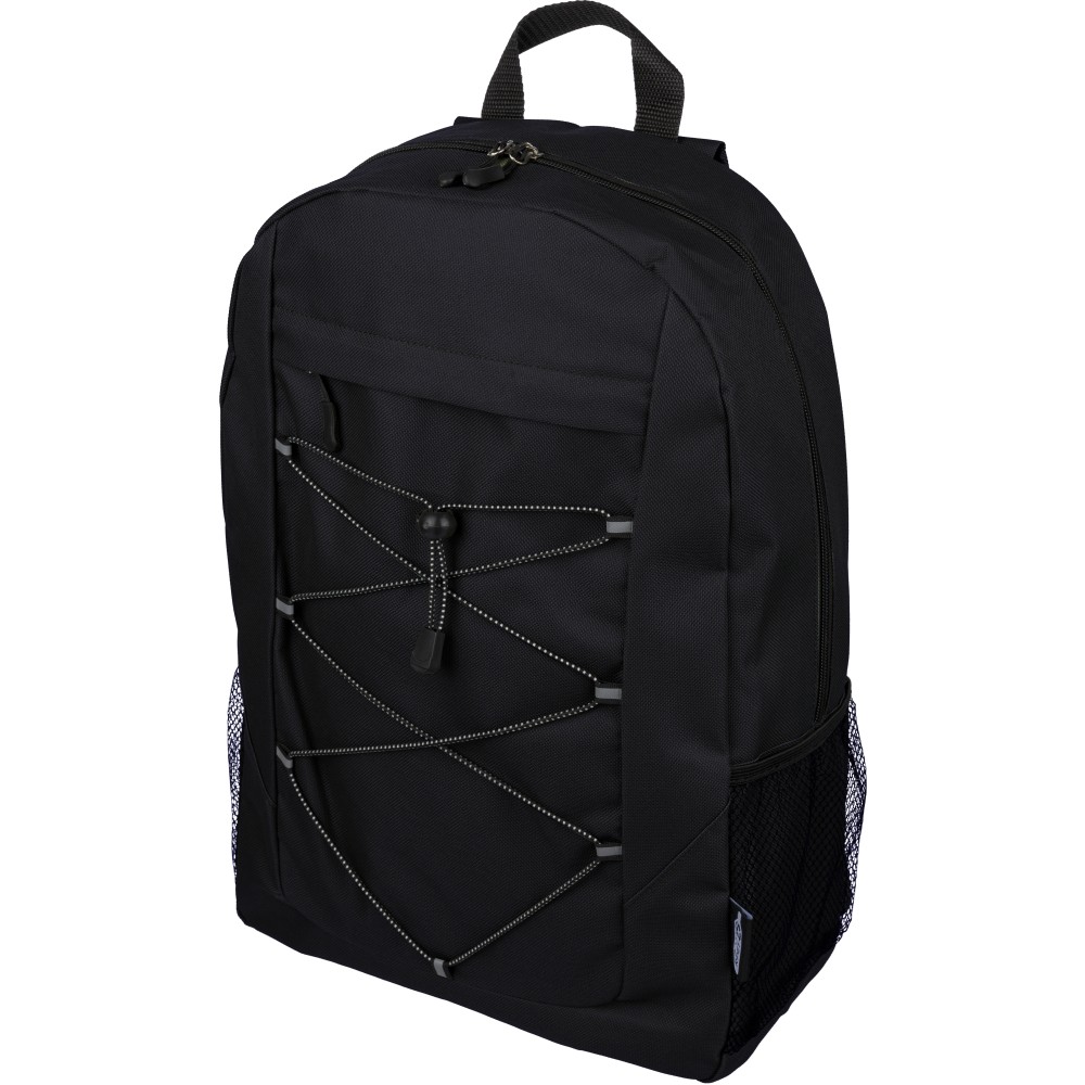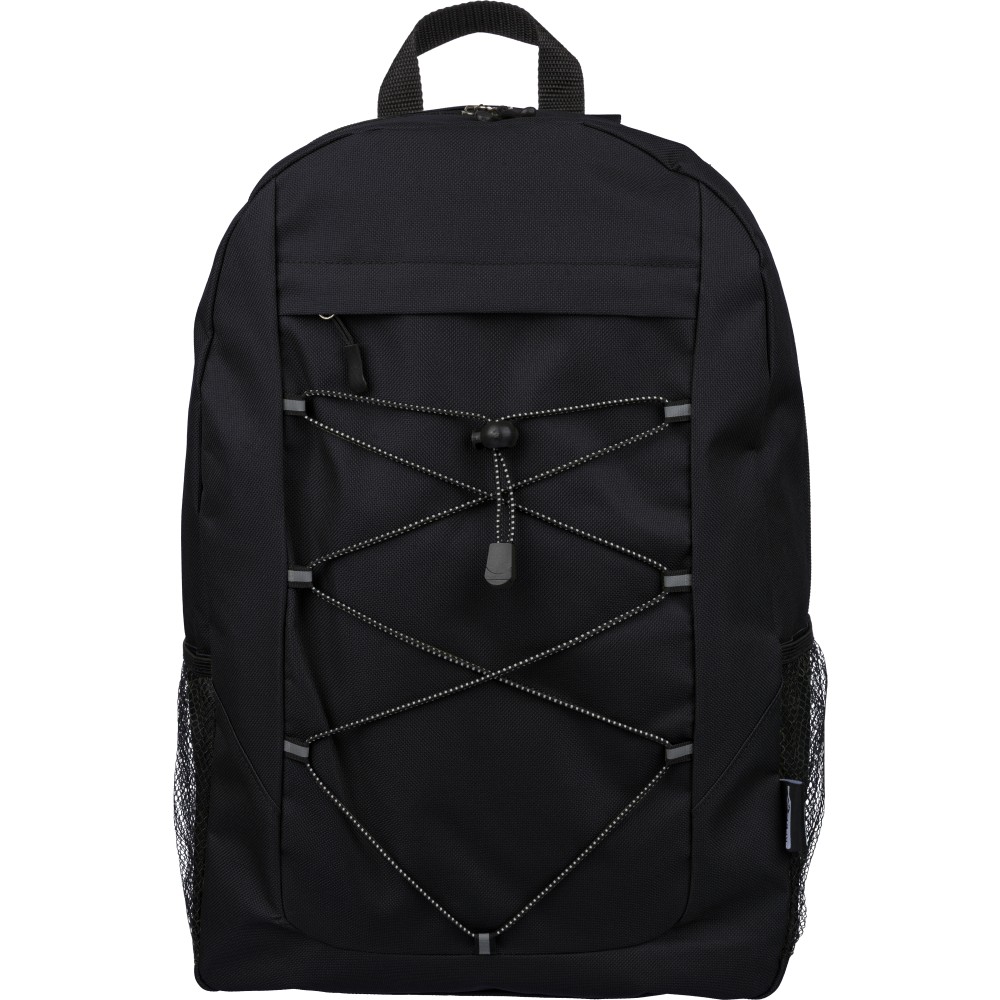 rPET polyester 600D adventure backpack with drawstring closure and large zippered main compartment. Features mesh side pockets, elastic front bands, small front zip pocket for decoration, adjustable straps, and rPET label.