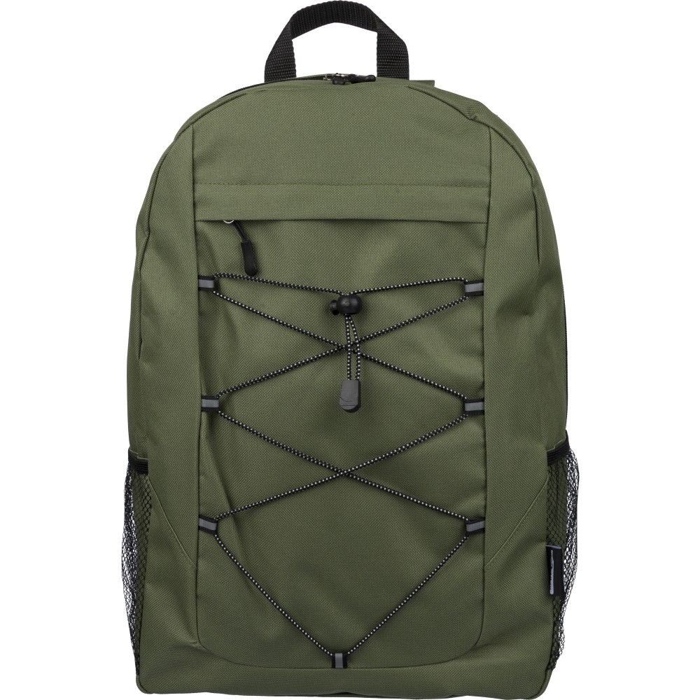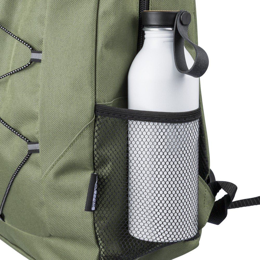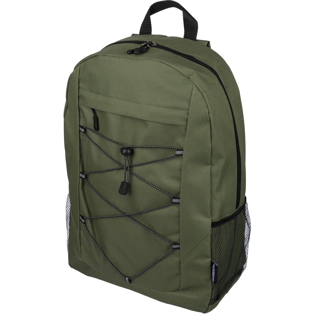rPET polyester 600D adventure backpack with drawstring closure and large zippered main compartment. Features mesh side pockets, elastic front bands, small front zip pocket for decoration, adjustable straps, and rPET label.