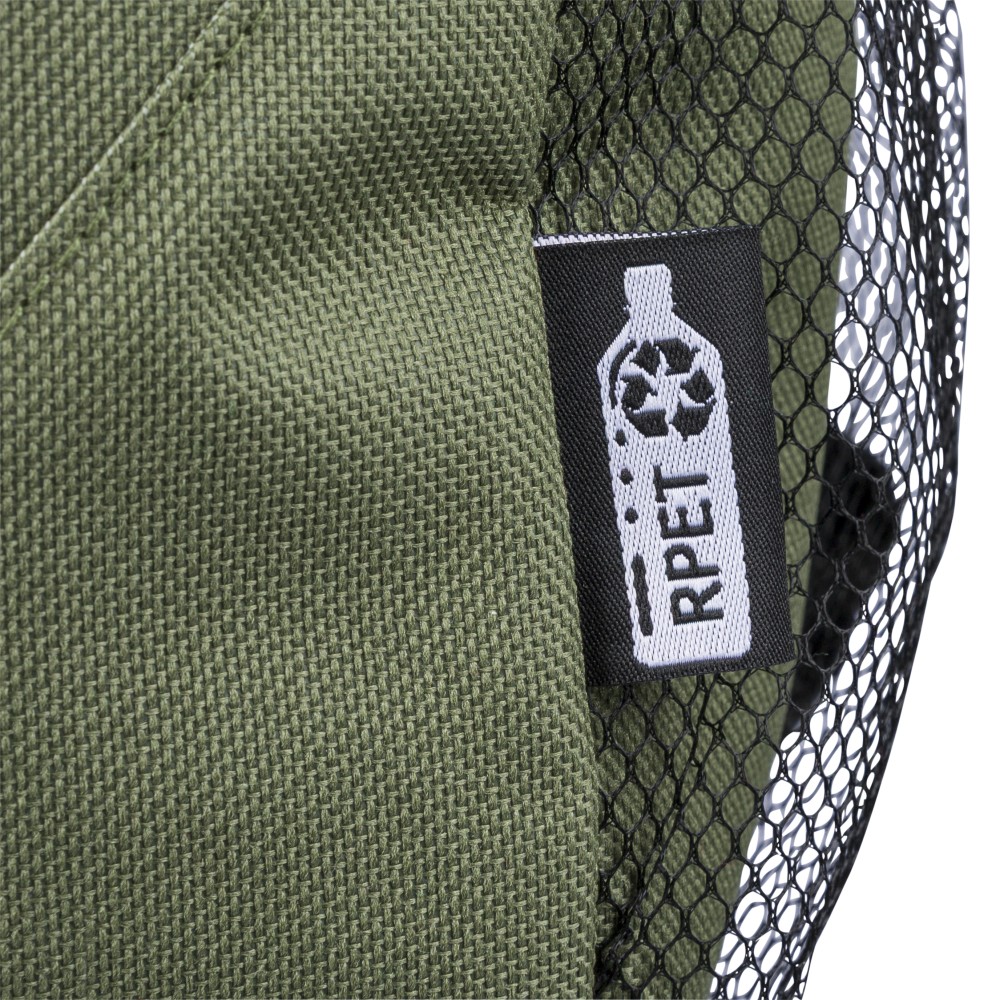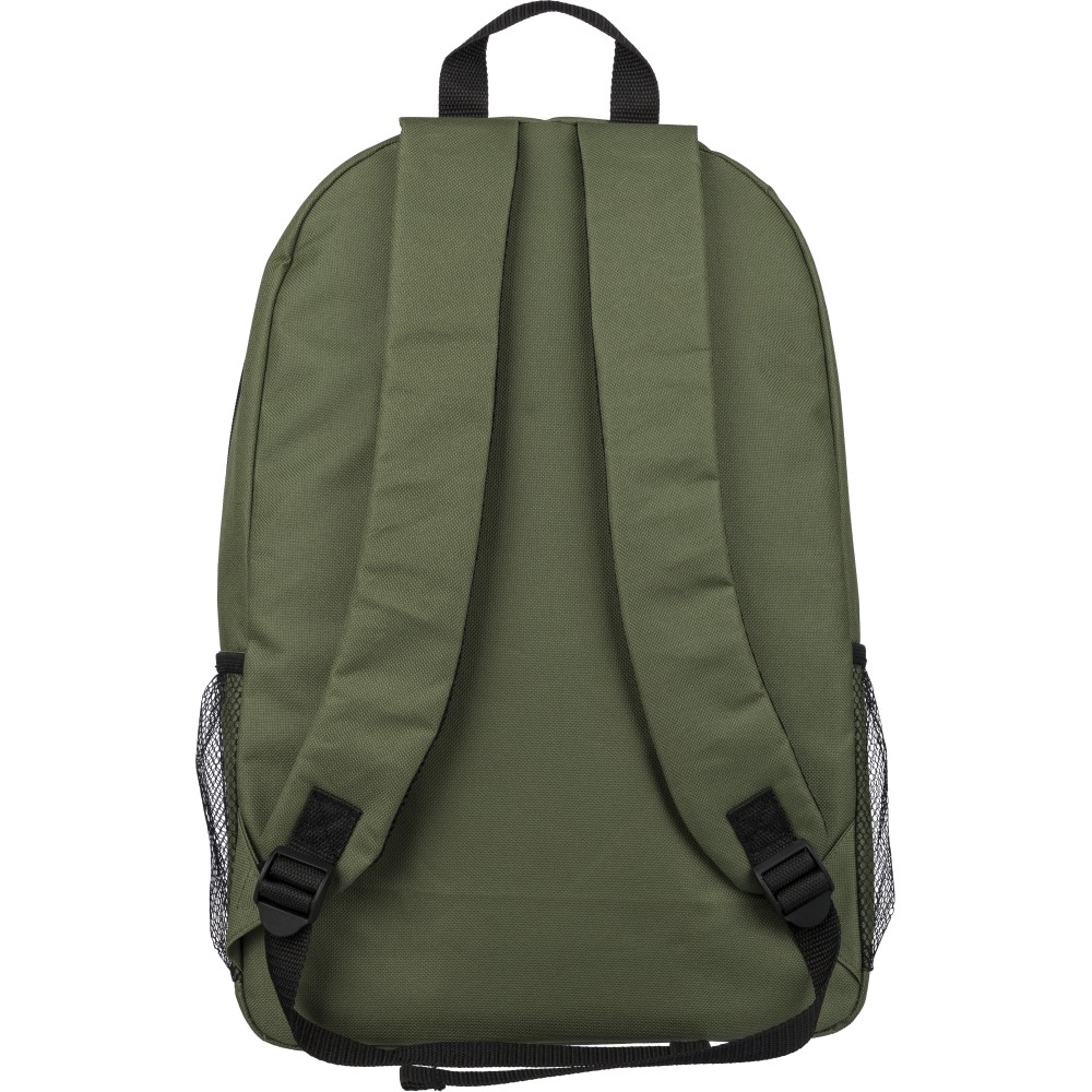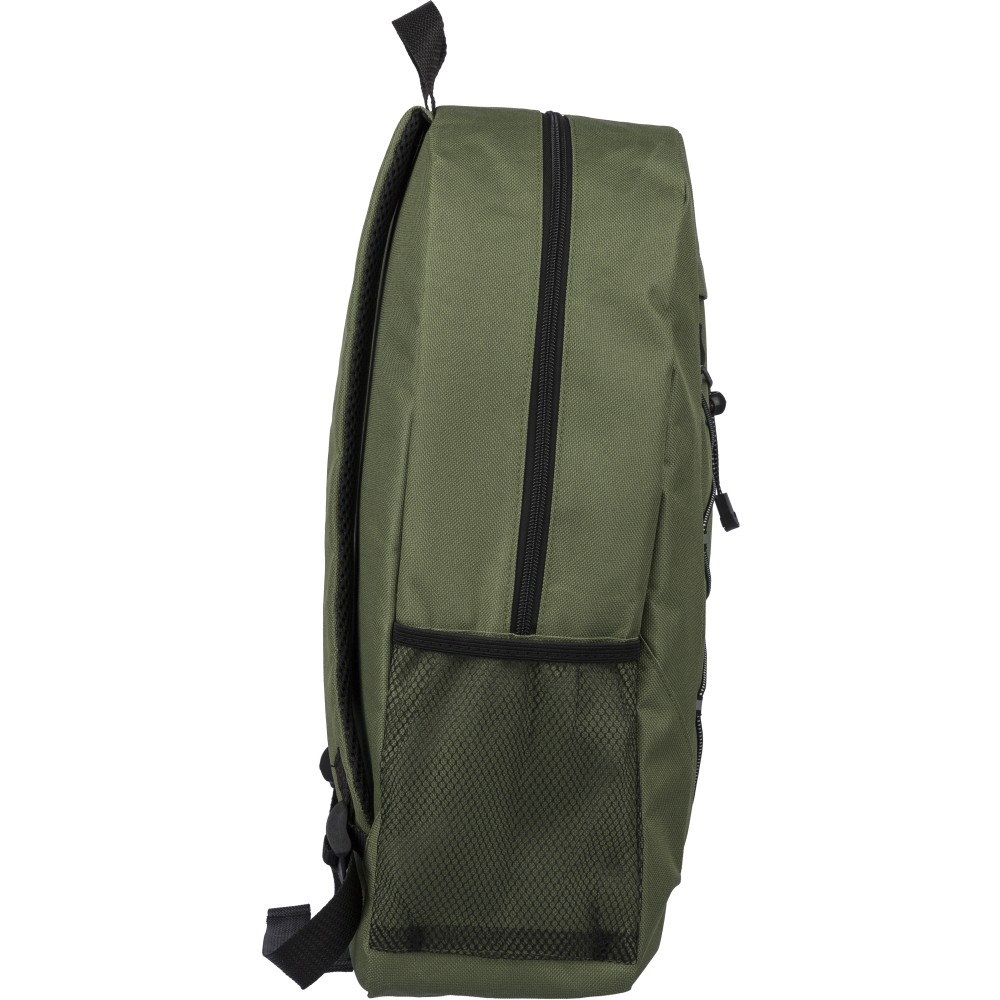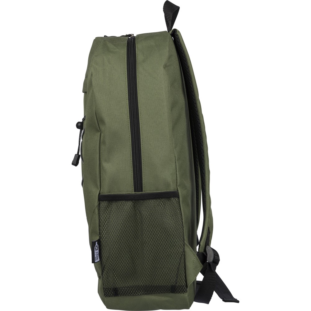 rPET polyester 600D adventure backpack with drawstring closure and large zippered main compartment. Features mesh side pockets, elastic front bands, small front zip pocket for decoration, adjustable straps, and rPET label.