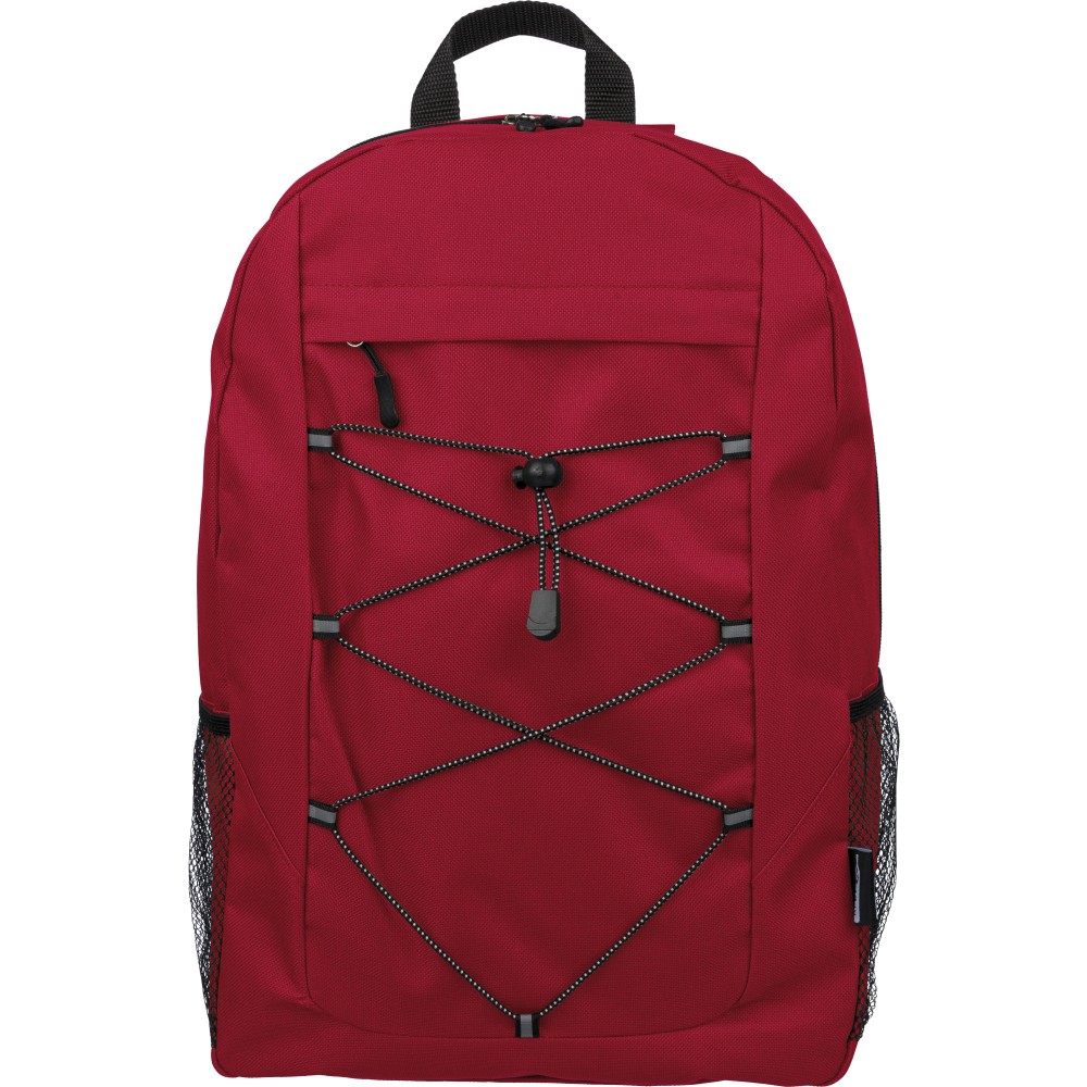 rPET polyester 600D adventure backpack with drawstring closure and large zippered main compartment. Features mesh side pockets, elastic front bands, small front zip pocket for decoration, adjustable straps, and rPET label.