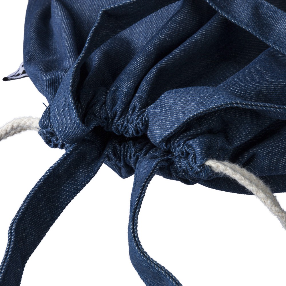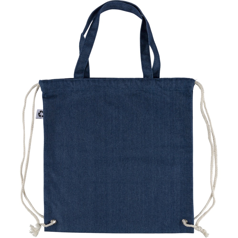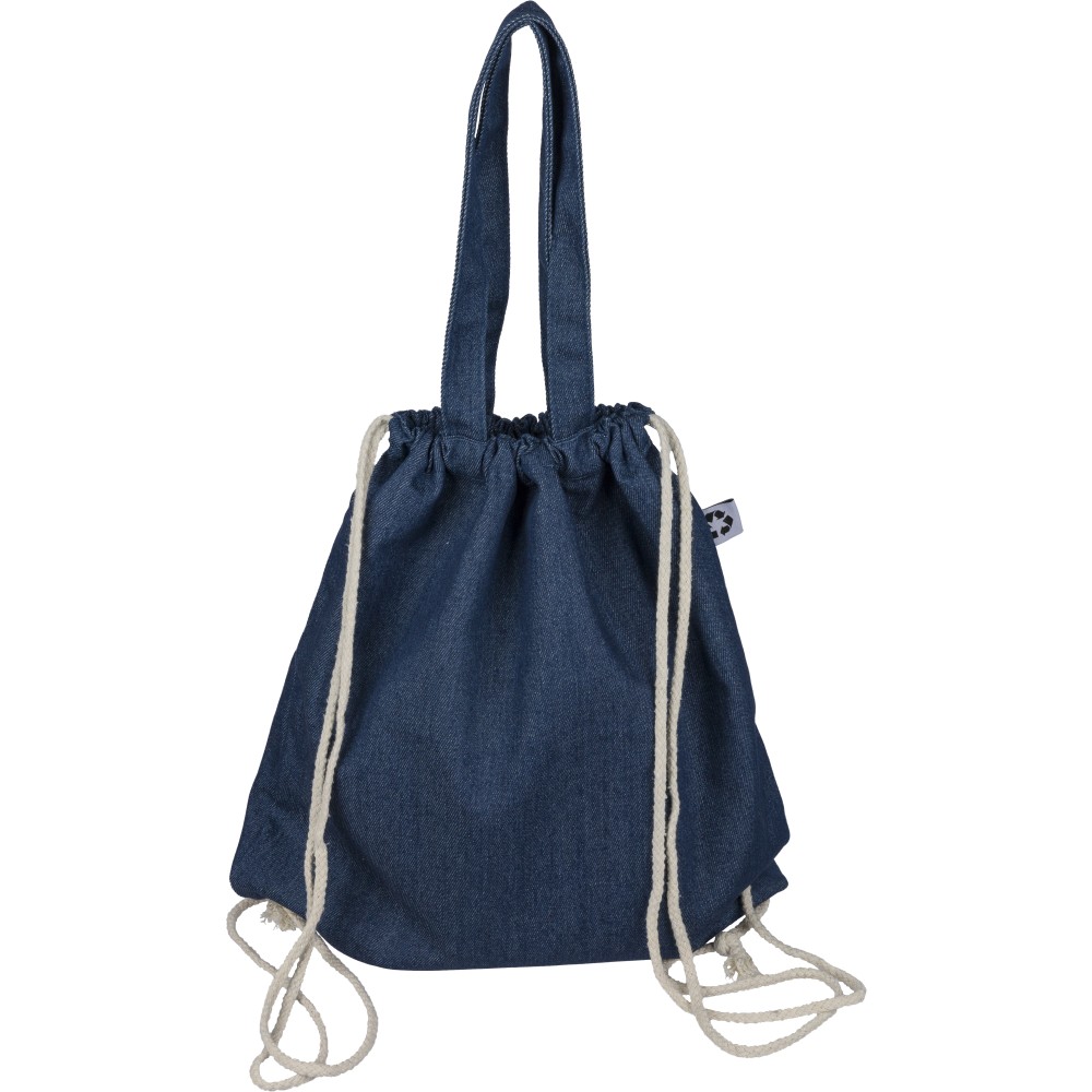 Recycled denim drawstring bag with size 40 x 38 cm. Features long handles of 2.5 x 50 cm and a pull cord for closing. Includes a recycled label on the outside and can be carried by shoulder straps or hand loop.