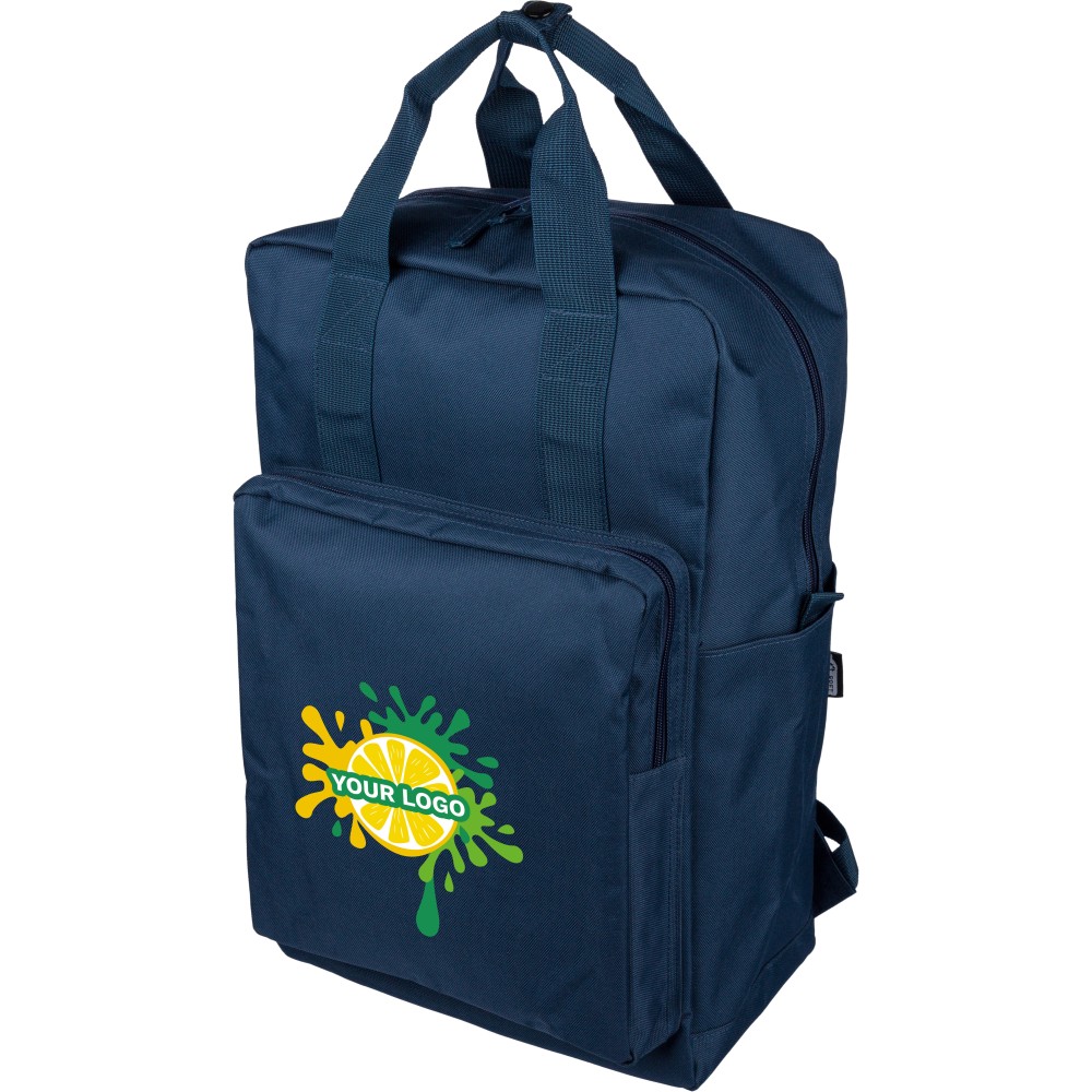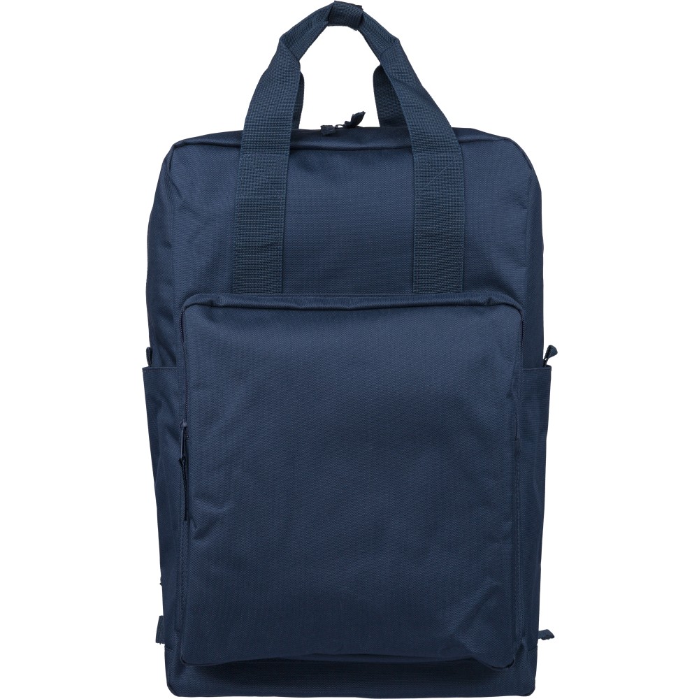 Recycled 900D polyester backpack with 210D lining and rPET label. Includes large main compartment with 16? laptop pocket, front compartment, two side pockets, trolley strap, top handles with button, and ventilated shoulder straps.