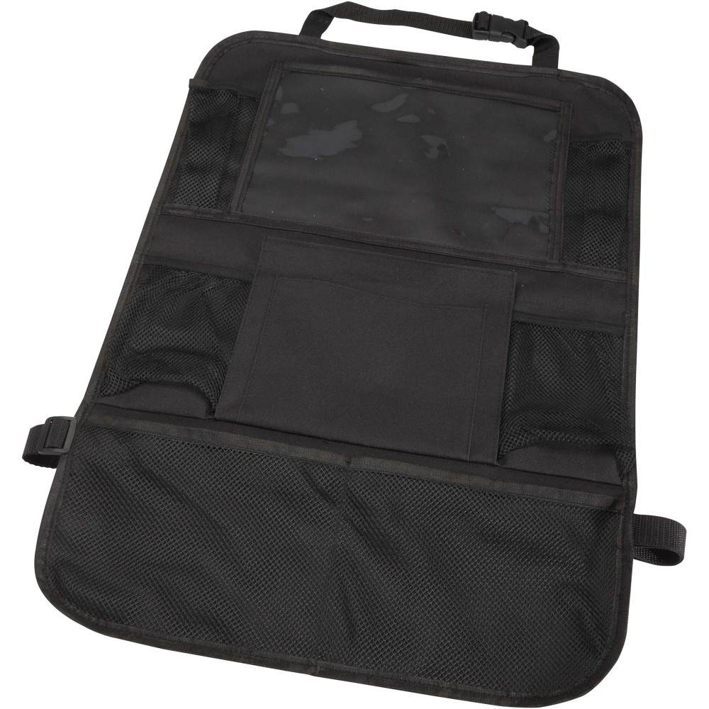 Car back seat organiser with multiple mesh pockets to hold essentials such as snacks, toys, or bottles, plus a PVC window for a tablet. It attaches easily to the front seat and helps keep your car tidy and clutter-free ? ideal for families, road trips, or everyday use.