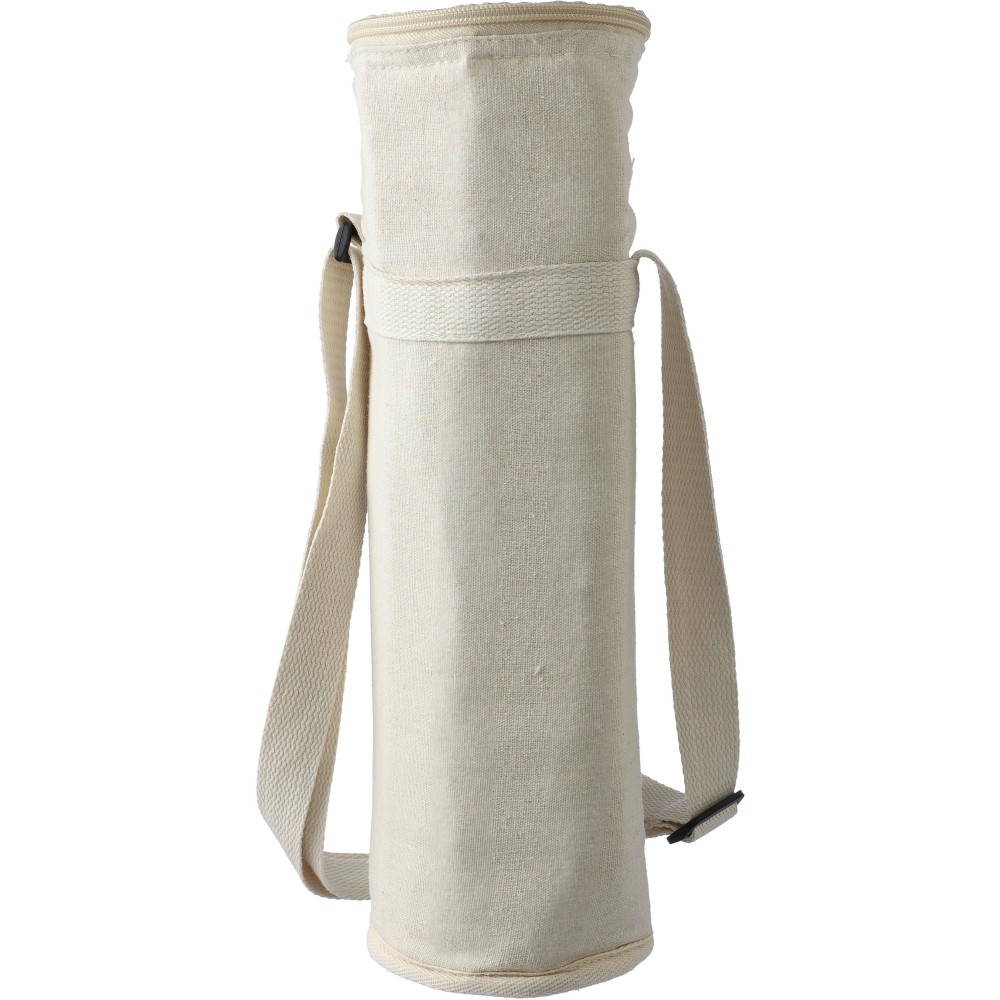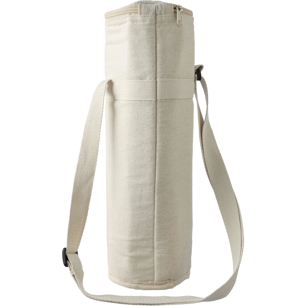Recycled cotton (270 gsm) bottle cooler bag with 2 mm EPE and 12C PEVA lining inside. Zipper closure. Long adjustable carrying strap. Capacity: 1.5-liter bottle. Includes recycled cotton label on the outside.