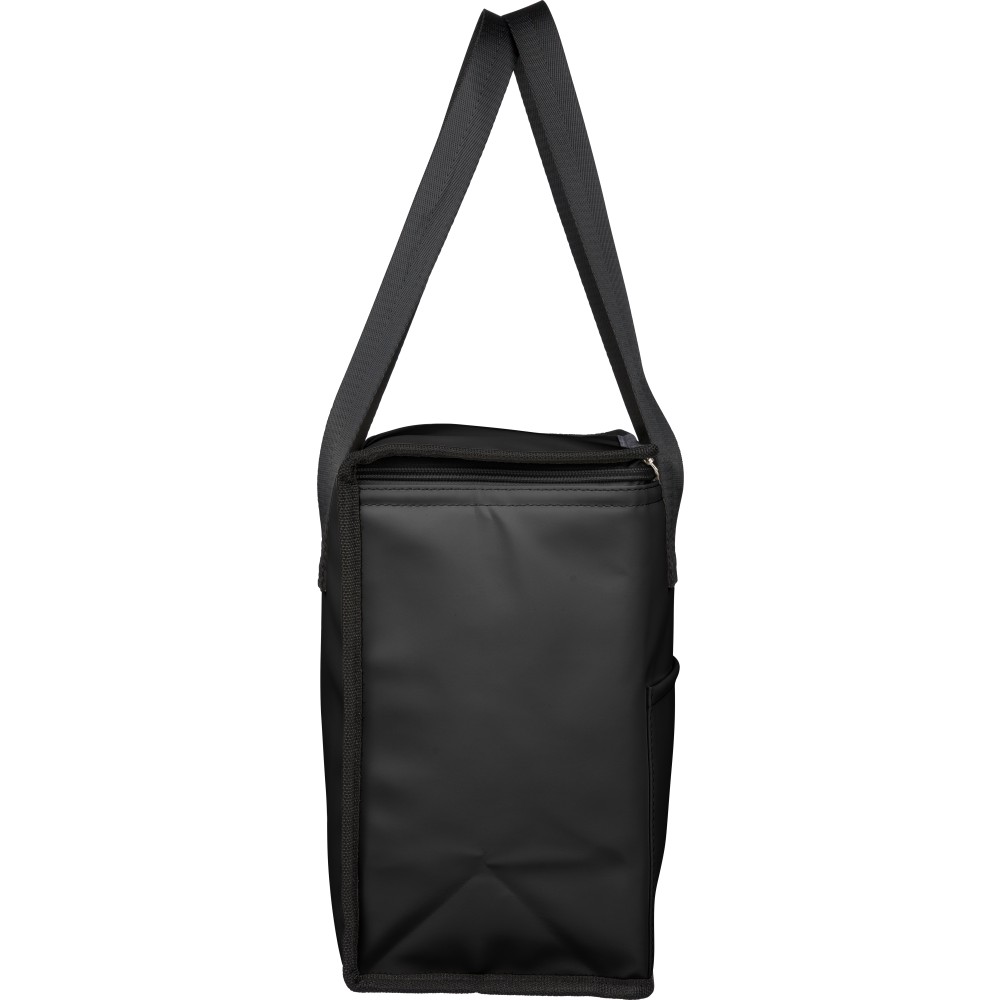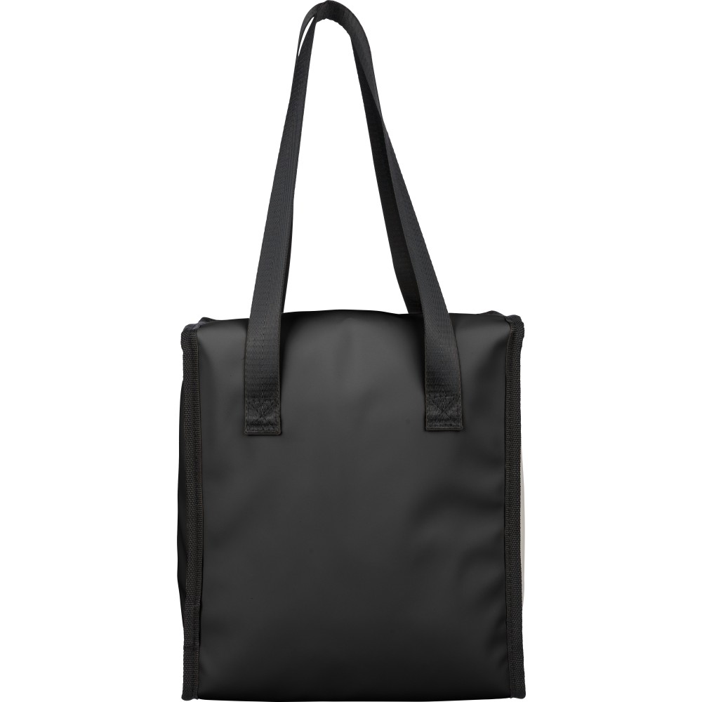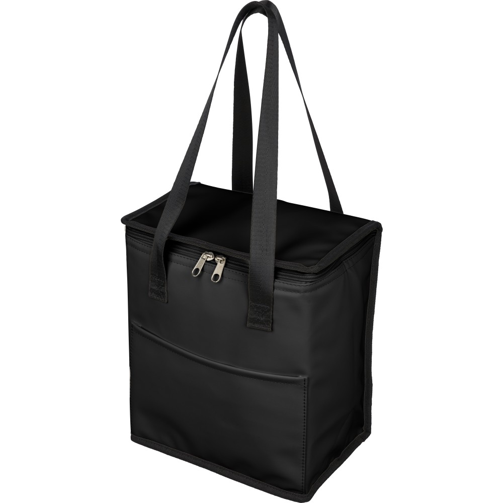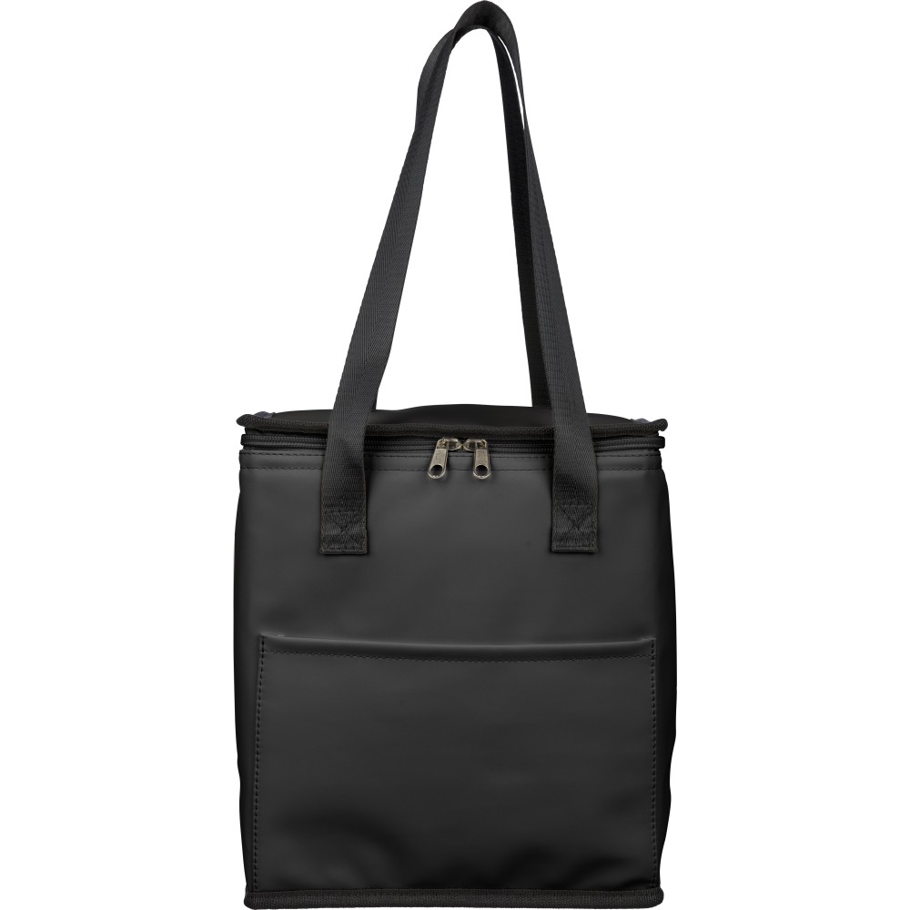 Recycled PU cooler bag (9 L capacity) with 210D recycled polyester lining. Features long carrying handles (2.5 × 66 cm) and a front pocket for additional storage. Includes a small recycled logo inside the label.