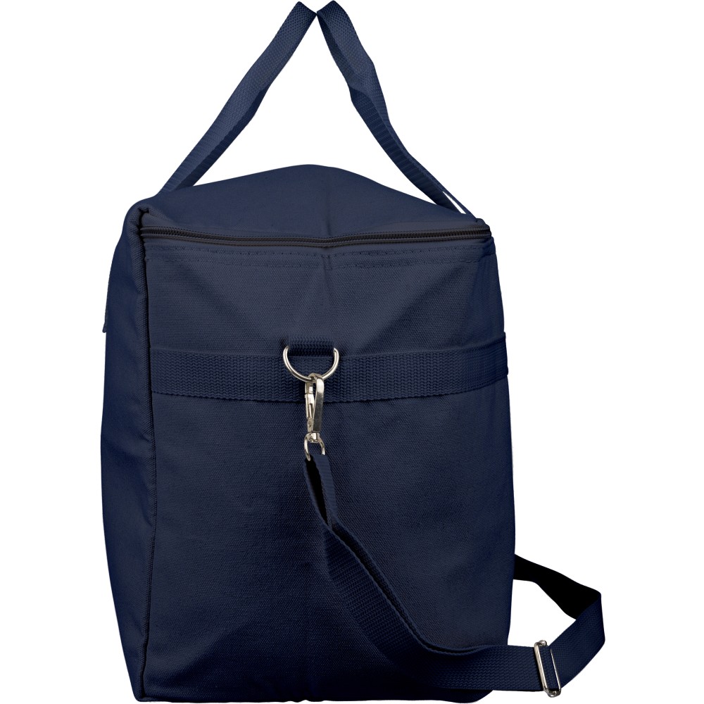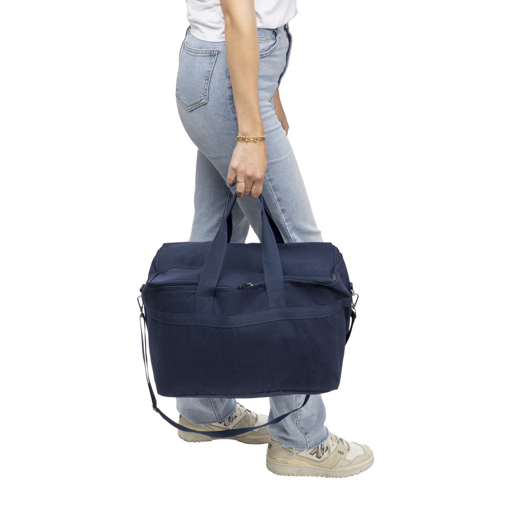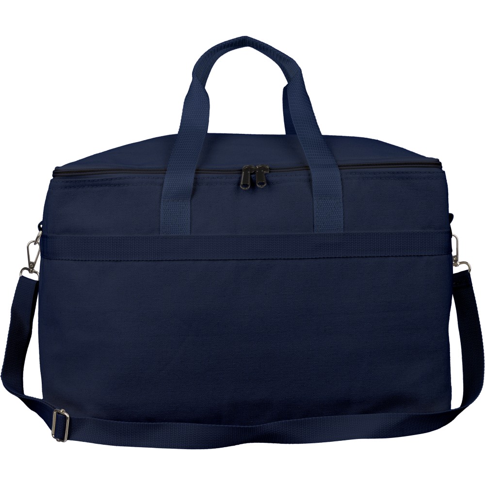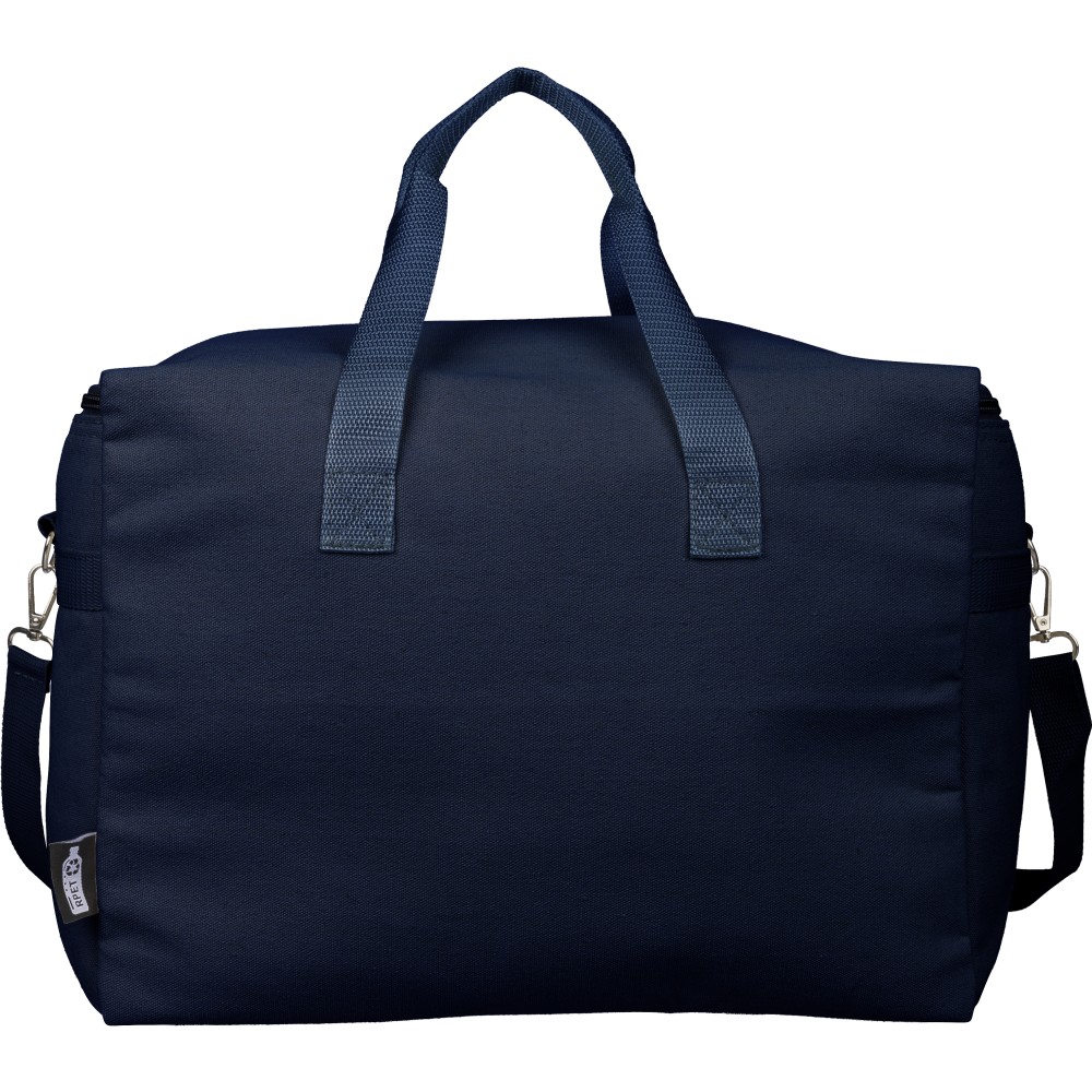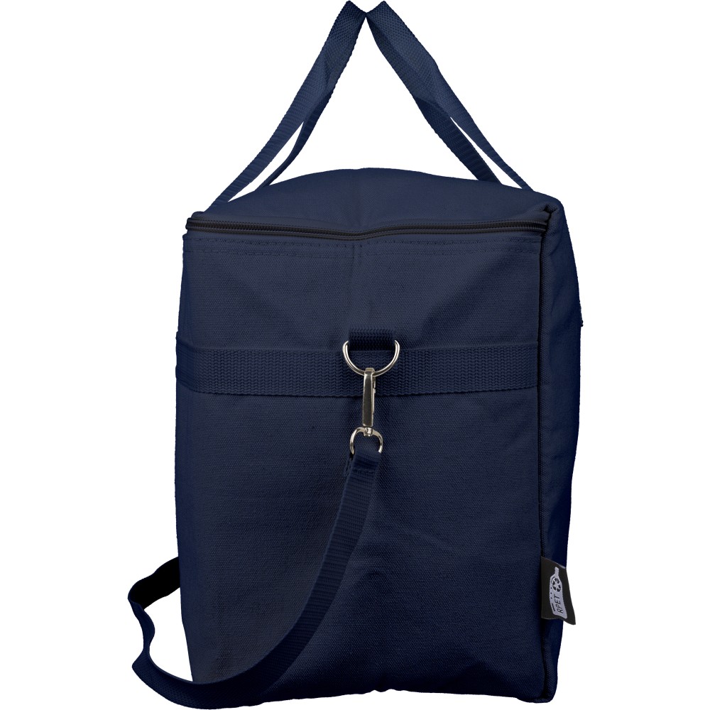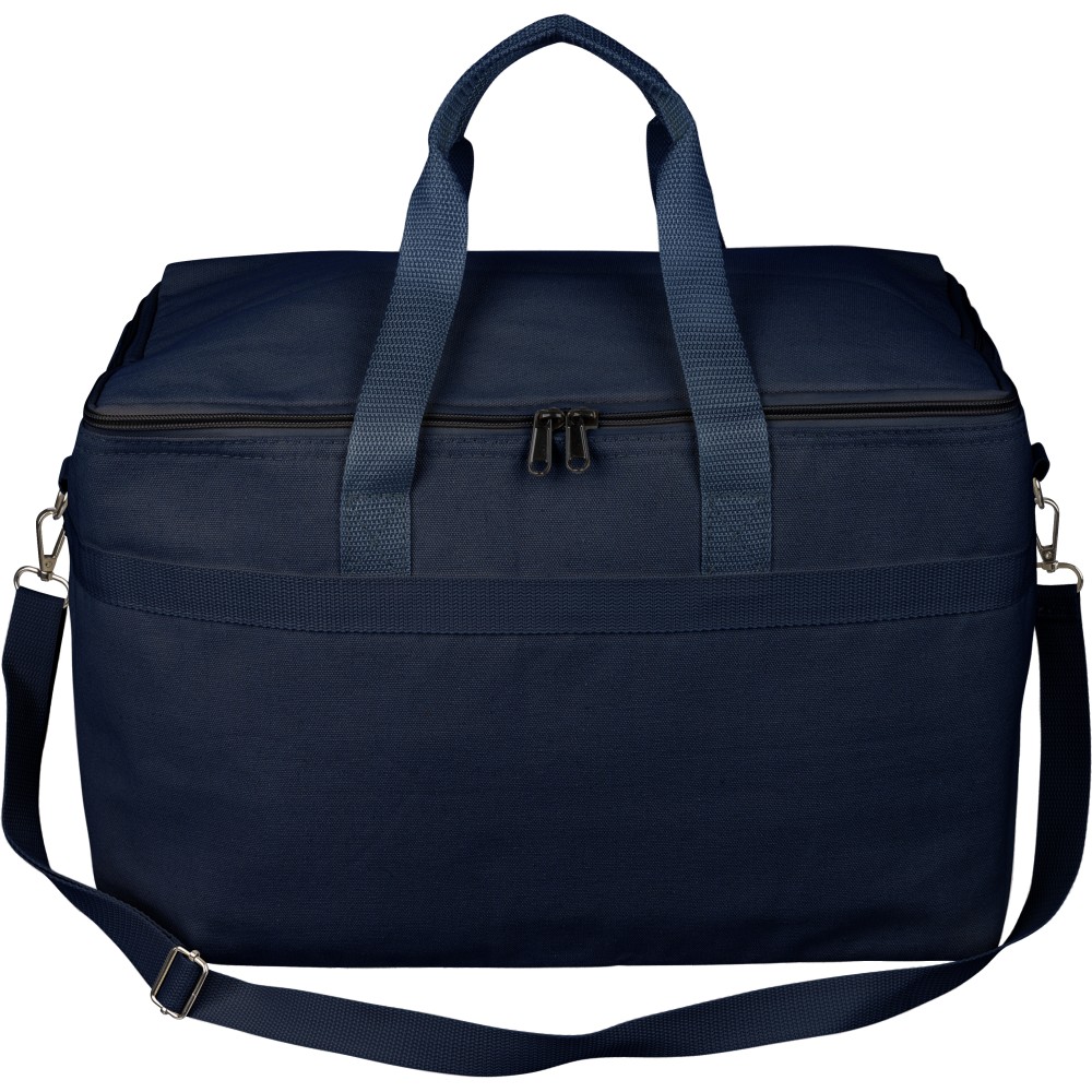 Recycled polycotton (330 gsm) cooler bag with aluminium foil insulation. Features 23L capacity. 60 cm handles (3.5 cm wide), adjustable 110 cm shoulder strap (2.5 cm wide) with metal buckle, and matching webbing. Includes rPET label outside and label inside.