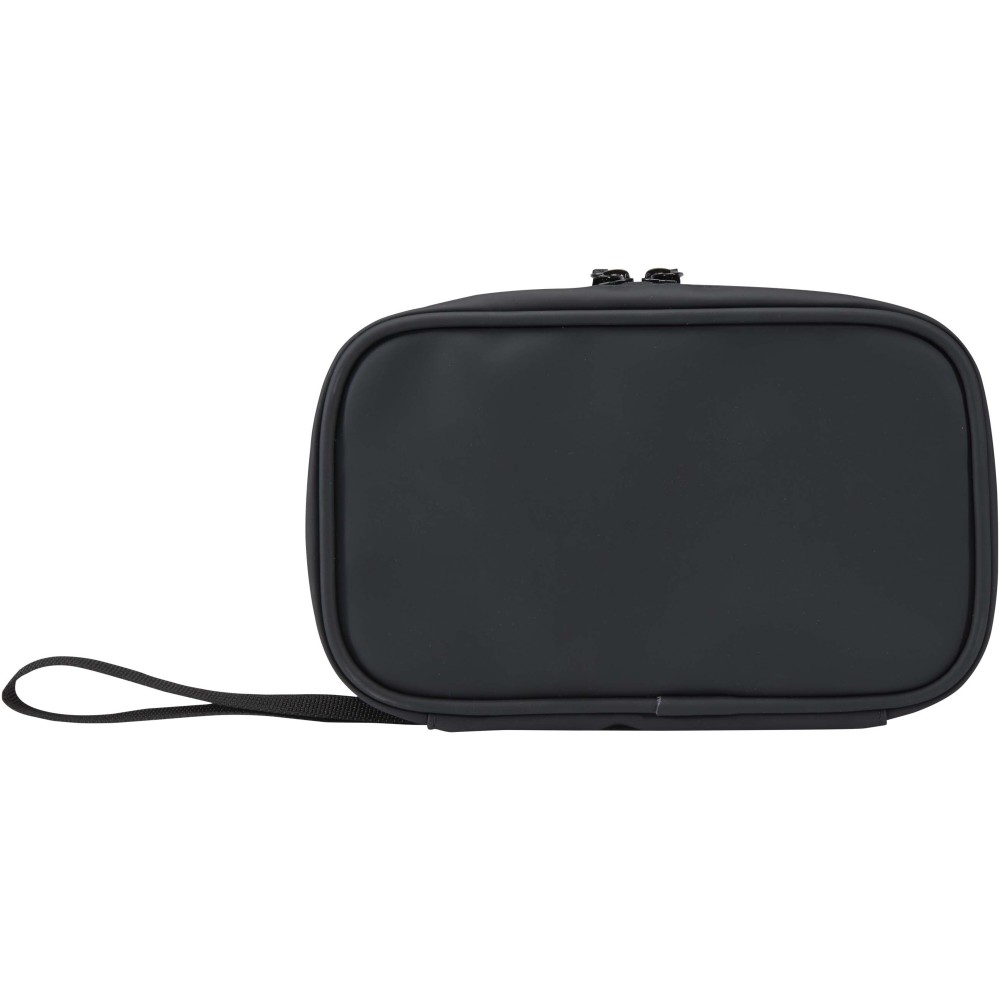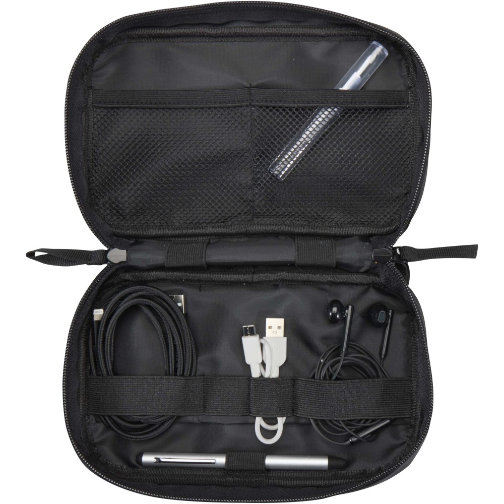 Made from GRS certified recycled PU leather with a matching RPET lining, this tech pouch is designed for travellers, remote workers, and tech enthusiasts. Compact and easy to carry in a backpack or cabin bag, it has a zipped main compartment with practical organisation features including an elastic pen loop, two mesh pockets for earbuds and small accessories, a reinforced divider, and multiple elastic loops to securely hold cables, USB drives, and chargers. The exterior includes a front pocket with hook-and-loop closure for quick access, along with a webbing handle for convenience. Finished with a water-resistant coating, it keeps your essentials protected wherever you go. Volume capacity: 1 litre.