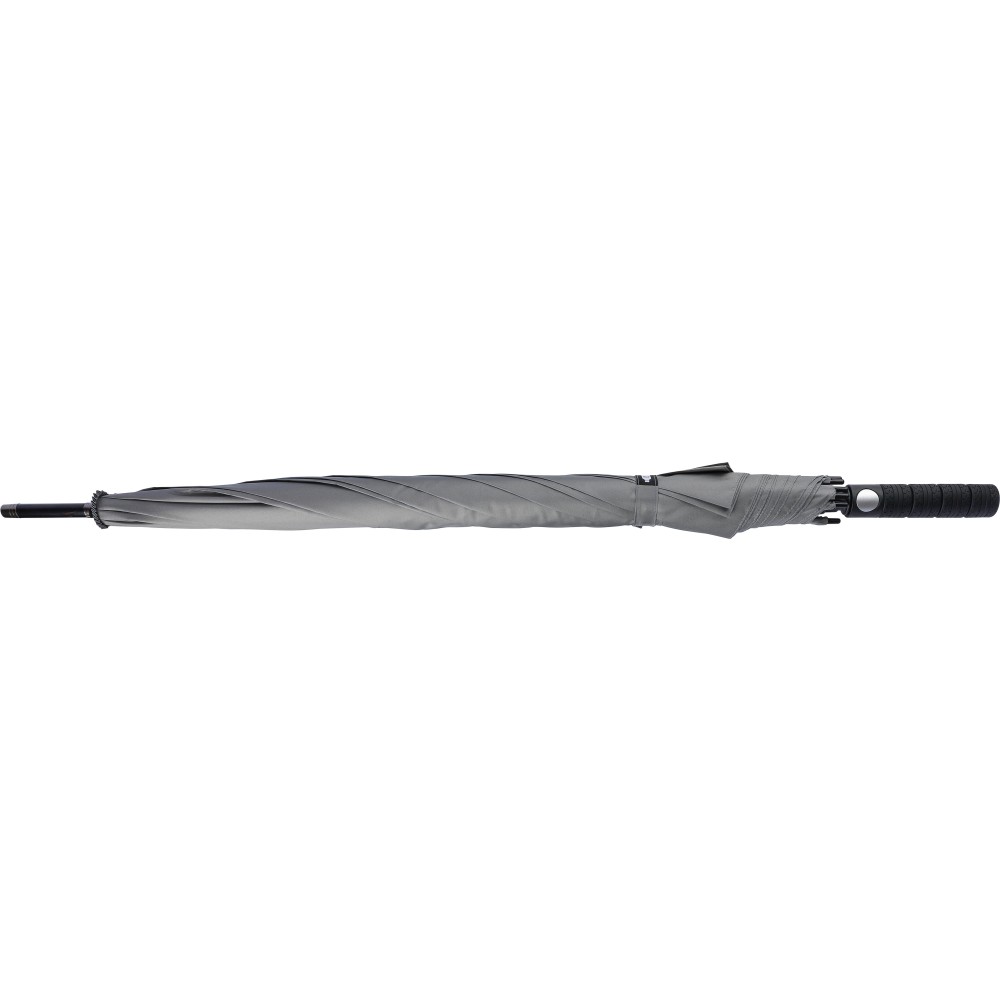 rPET 190T automatic golf umbrella (27 inch) with eight panels and a fiberglass frame. Features a push-button opening and an rPET label on the Velcro closure. Windproof.