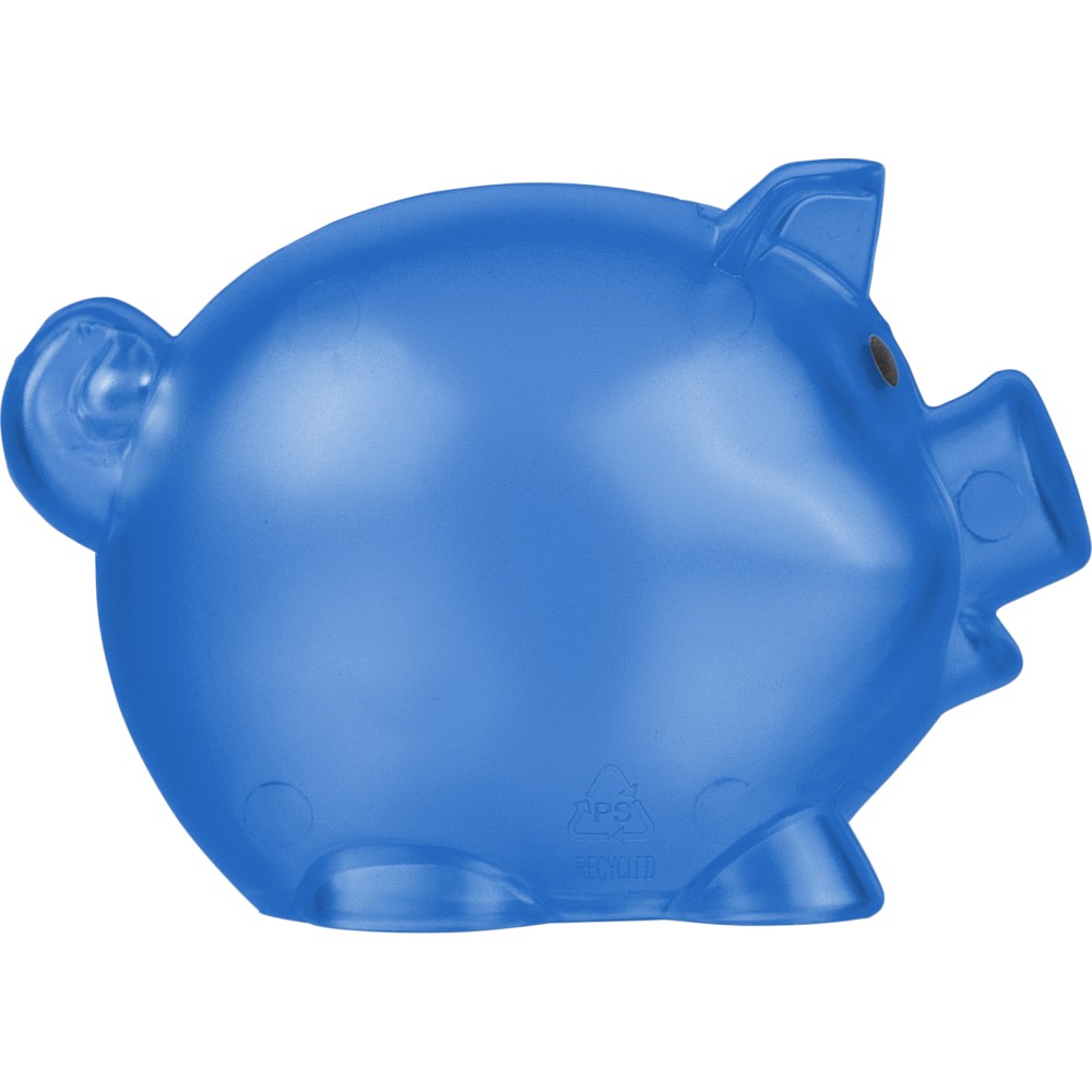 Recycled PS plastic piggy bank in pig shape. Transparent version with recycled logo on the backside.