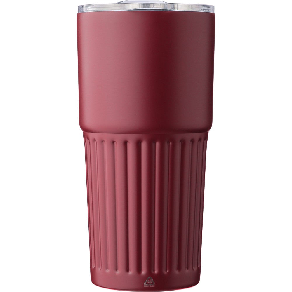 Recycled stainless steel double-walled drinking mug (500 ml). The interior is made of stainless steel 304 and the exterior is stainless steel 201 with a ridge grip design. Features an AS lid with a slide closure. Includes an engraved recycled logo on the body. Individually packaged in a brown cardboard box.