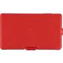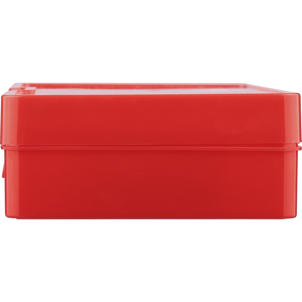 PP first aid set in red case with white cross on the topside and clip closing. Compact cassette design containing 15 parts: 2 non-woven sponges, 5 bandages, 4 alcohol pads, 1 pair of scissors, 1 roll gauze bandage (450 cm) and 1 roll of tape (450 cm).