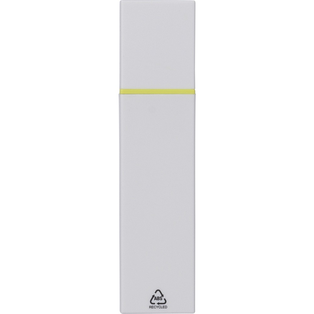 Recycled ABS text marker with white body and colored detail. Features a click closure and includes a 2-year warranty against drying out. Marked with the Recycled ABS logo.