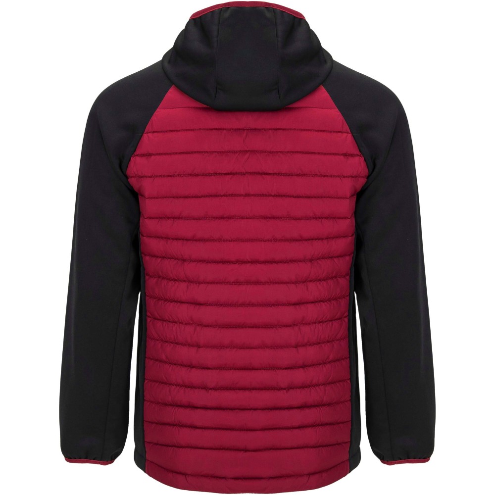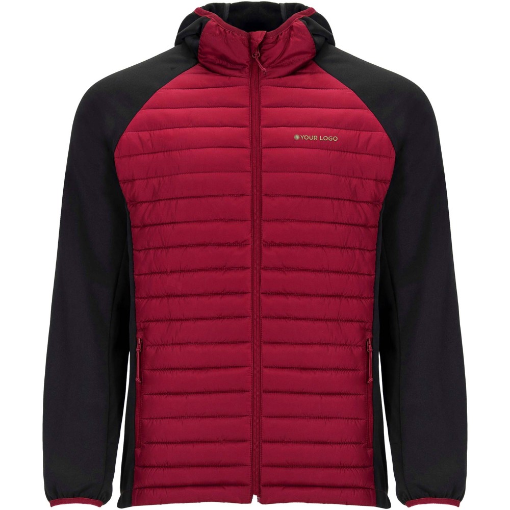 Unisex jacket in two-fabric combination: Fixed adjusted hood. Raglan sleeves. Sleeves, side panels and hood in softshell fabric. Quilted feather touch fabric in front and back. Inverted zip with matching chin protector and puller. Two front pockets with zippers. Matching elastic trim in collar, cuffs and hem. Removable label. Wind-proof model. The male model is 184 cm and is wearing size L, and the female model is 179 cm and is wearing size S.