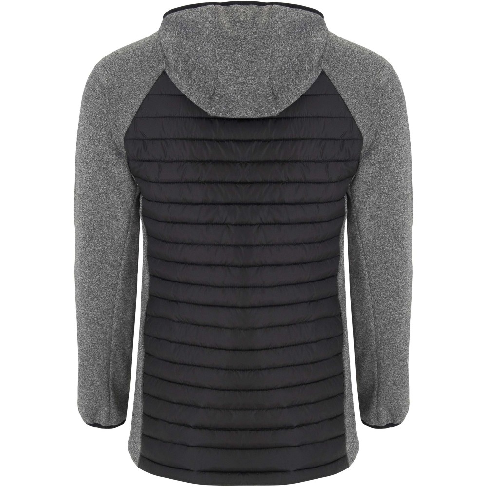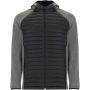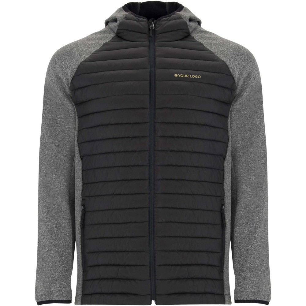 Unisex jacket in two-fabric combination: Fixed adjusted hood. Raglan sleeves. Sleeves, side panels and hood in softshell fabric. Quilted feather touch fabric in front and back. Inverted zip with matching chin protector and puller. Two front pockets with zippers. Matching elastic trim in collar, cuffs and hem. Removable label. Wind-proof model. The male model is 184 cm and is wearing size L, and the female model is 179 cm and is wearing size S.