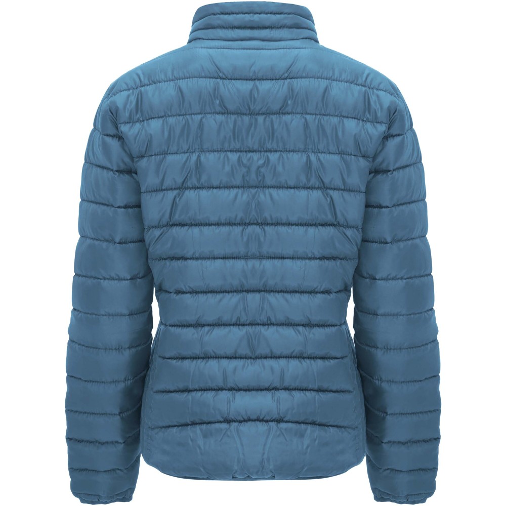 Women's quilted jacket with feather touch padding. Inverted zippers with matching chin protector and puller. Two front pockets with zippers. Matching elastic edging in collar, cuffs and hem. Contrasting inner lining. Includes stow carry bag. Lightweight and foldable garment. Fitted cut. Removable label. Water resistant. Wind-proof. The model is 179 cm and is wearing size S.