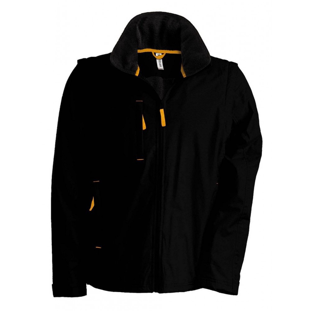 100% polyester with PVC coating. Polyester fleece lining. Comfortable fabric. Zip through front. 3 front zipped pockets. Detachable sleeves. Adjustable cuffs. Contrast zip pullers, neck tape and bartacks. 3 inside pockets, including 2 zipped pockets and 1 mobile phone pocket. Concealed hood. Contrast elasticated drawcord with toggles at hem. Zip access for decoration.