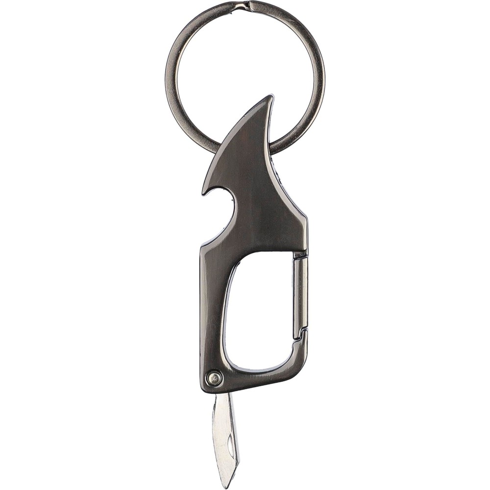 Metal carabiner keychain with a bottle opener and a small knife. The metal of the keychain is electrolyzed. Individually packaged in a brown paper bag.