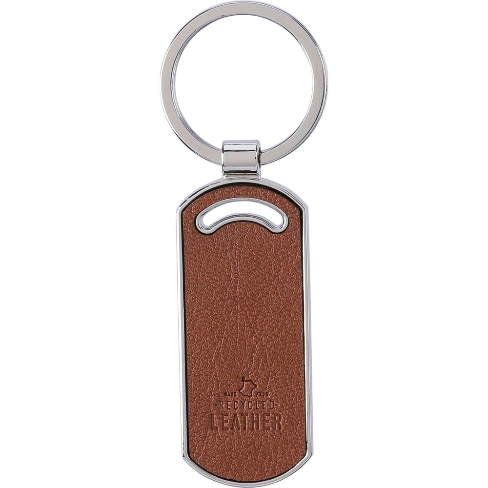 Recycled leather keychain with a metal ring. Oval shape. Includes embossed recycled leather logo on the side. Individually packaged in a brown cardboard sleeve.