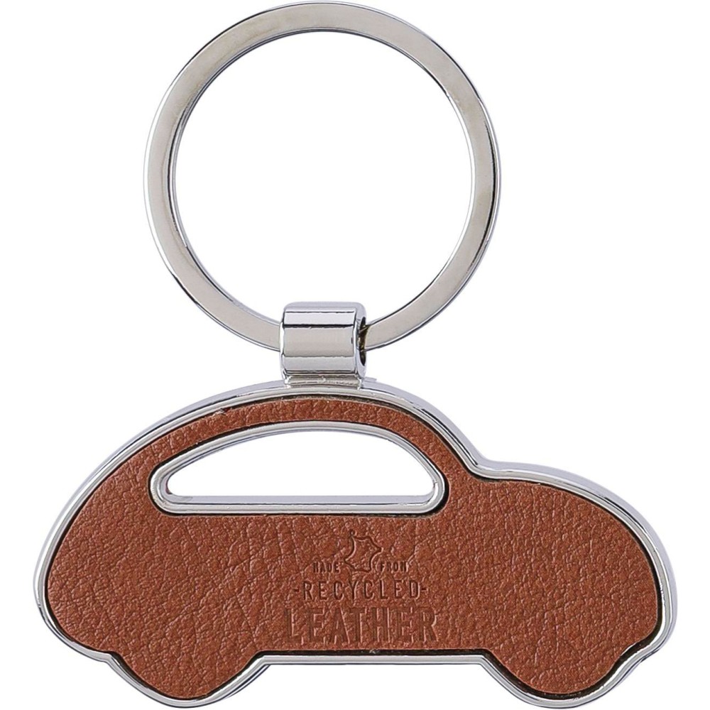 Recycled leather keychain with a metal ring. Car shape. Includes embossed recycled leather logo on the side. Individually packaged in a brown cardboard sleeve.