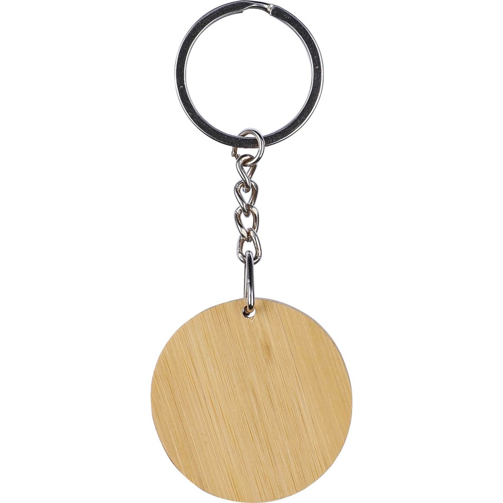 Bamboo keychain with a black rubber-coated stainless steel engraving plate inside, in a round shape. The color after engraving is shiny chrome. Individually packaged in a brown carton envelope.