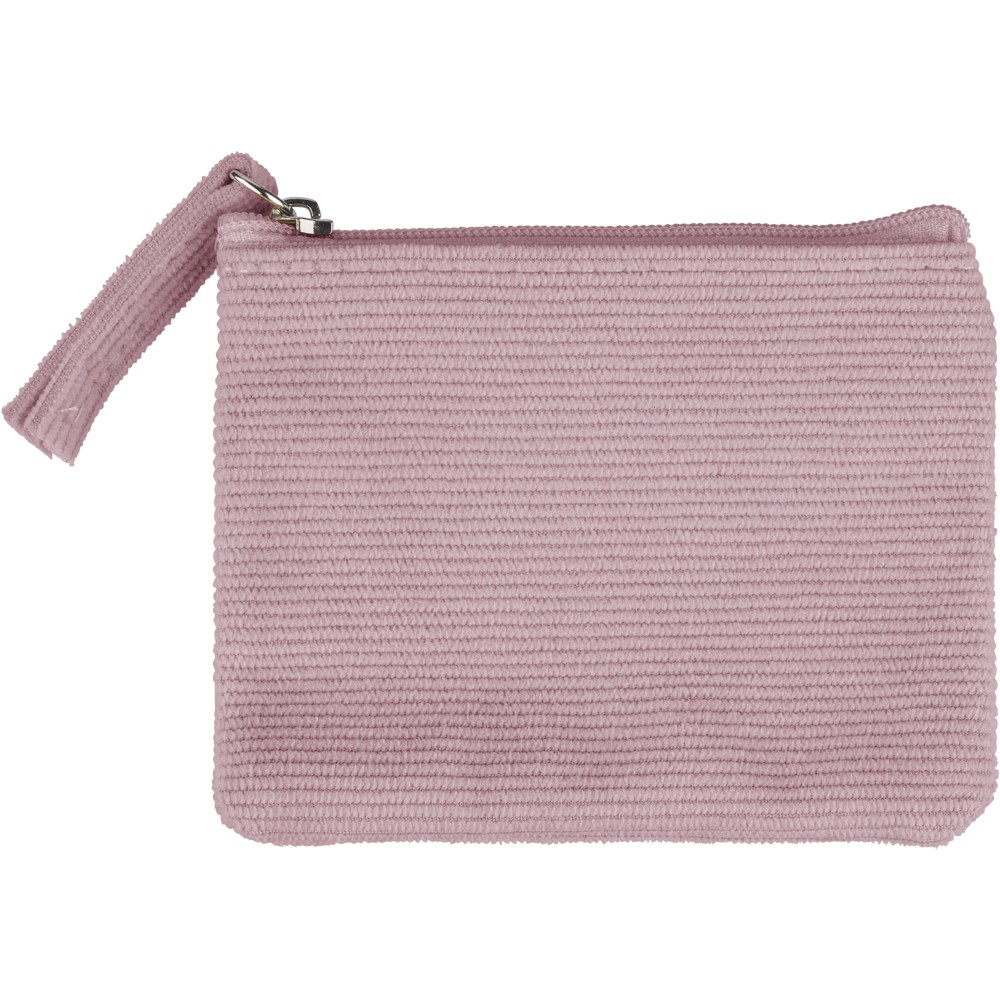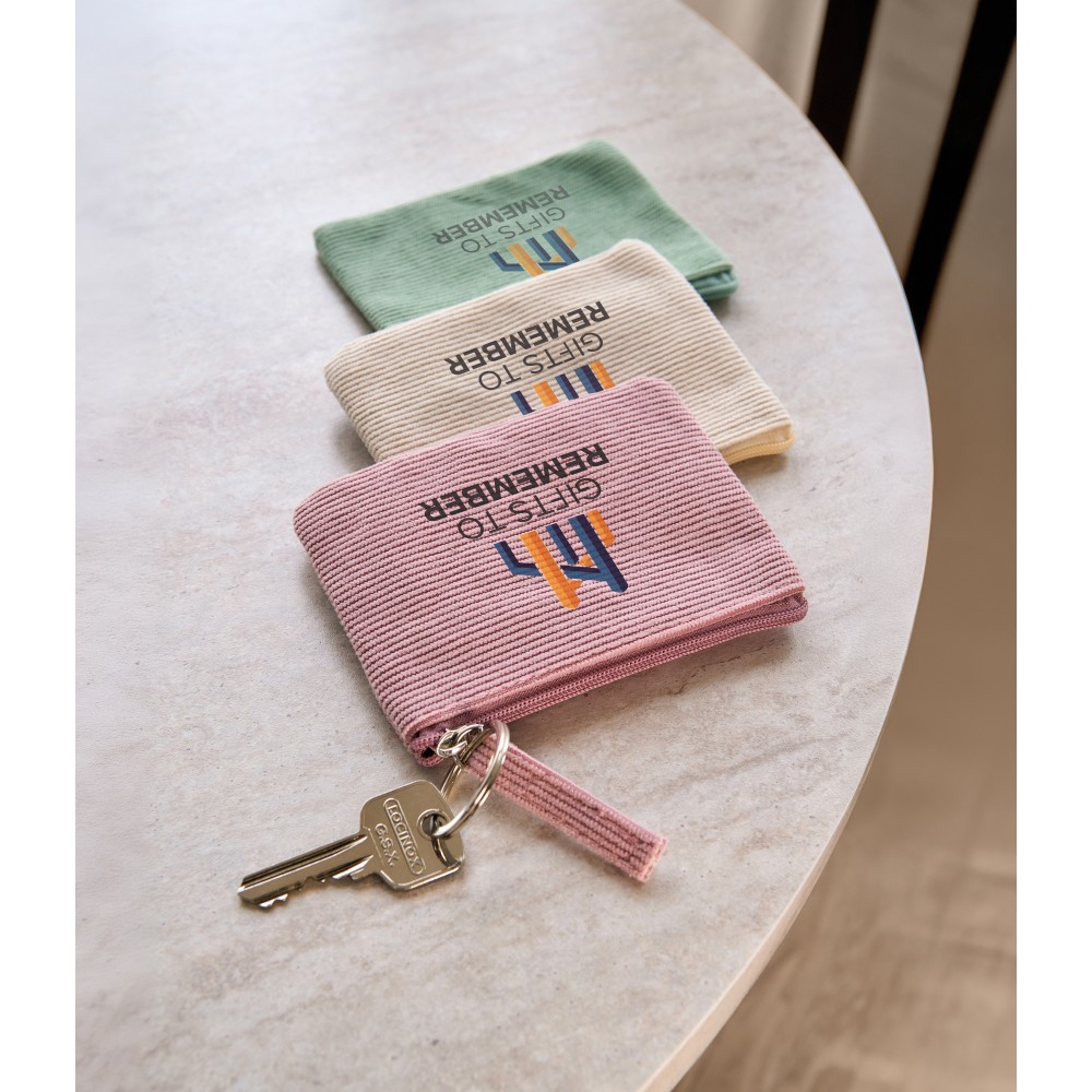 Corduroy zippered key wallet with secure zipper closing.
