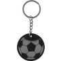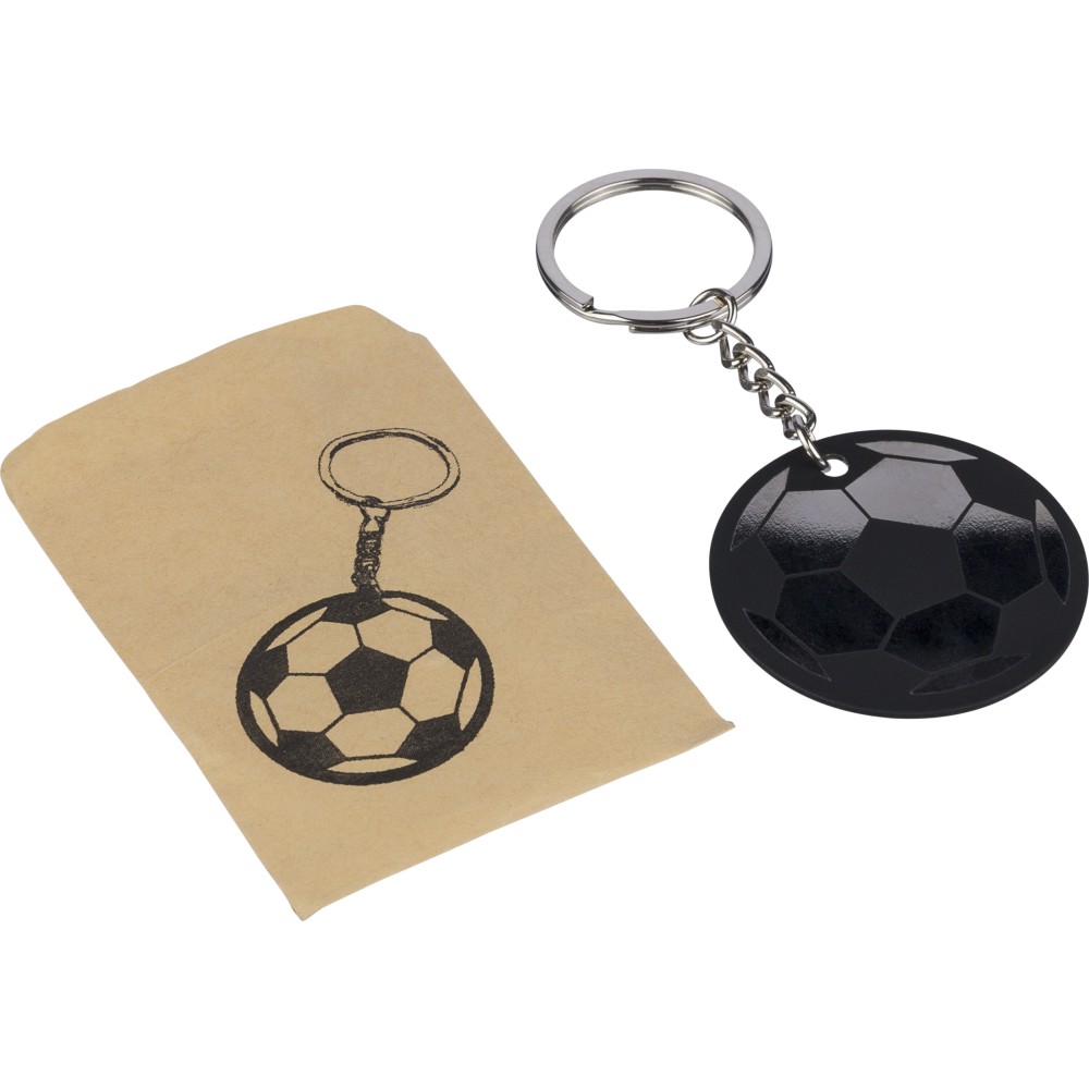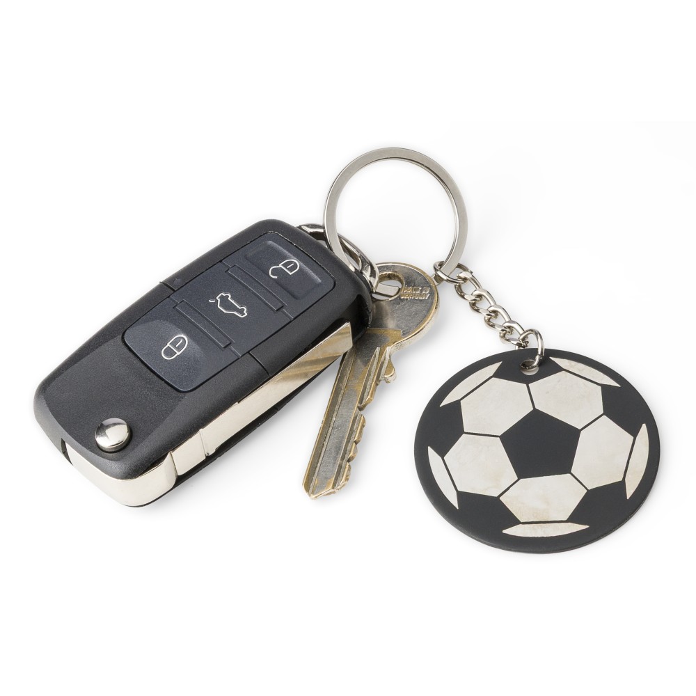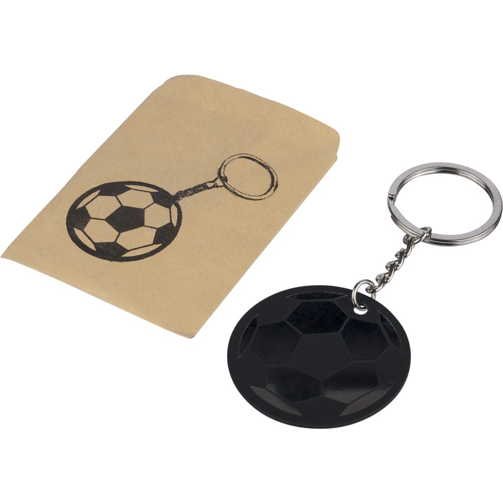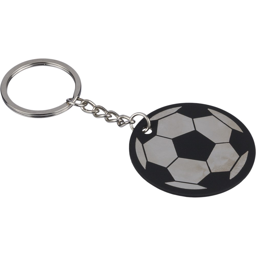 Recycled stainless steel rubberized keychain with metal ring in a round soccer ball design. Features an engraved recycled logo that reveals a shiny mirror effect after engraving. Individually packed in a kraft paper envelope.