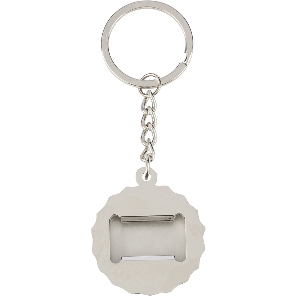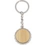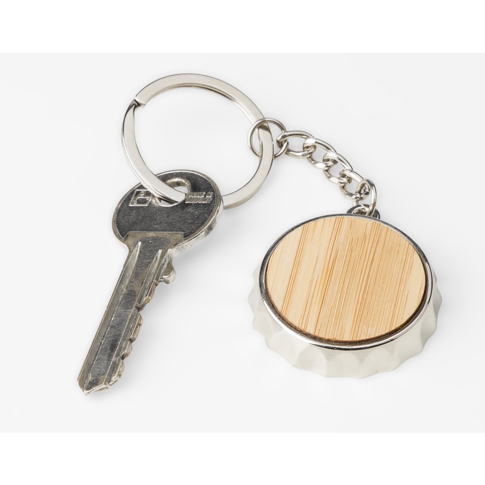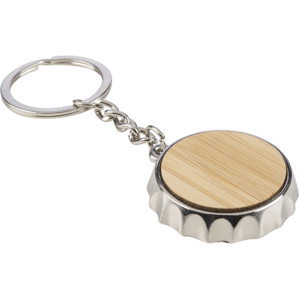 Zinc alloy keychain with bamboo inlay on the front and integrated bottle opener on the back. Features a metal keyring and is packaged in a paper bag.