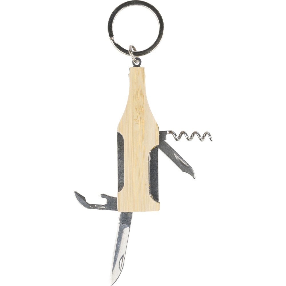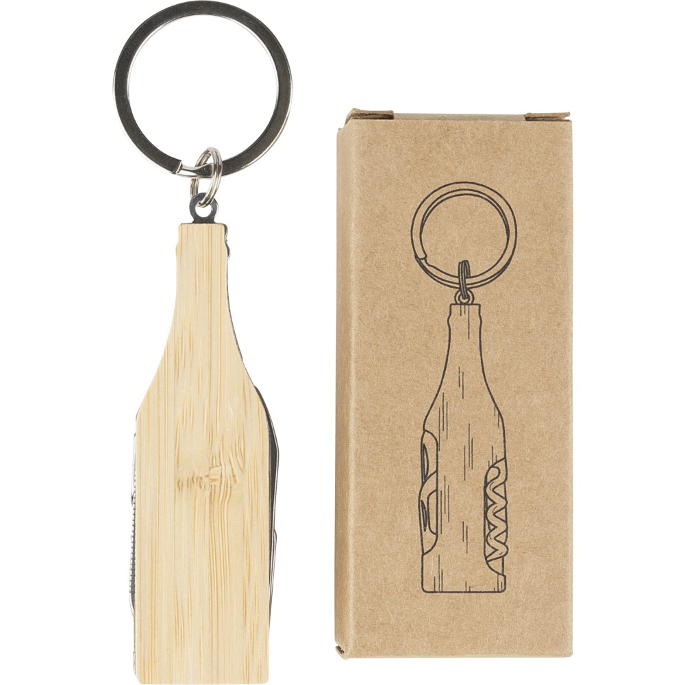 Bamboo and stainless steel multitool keychain in bottle shape with metal keyring. Includes corkscrew, nail file, bottle opener, and blade. Individually packaged in a brown paper box.