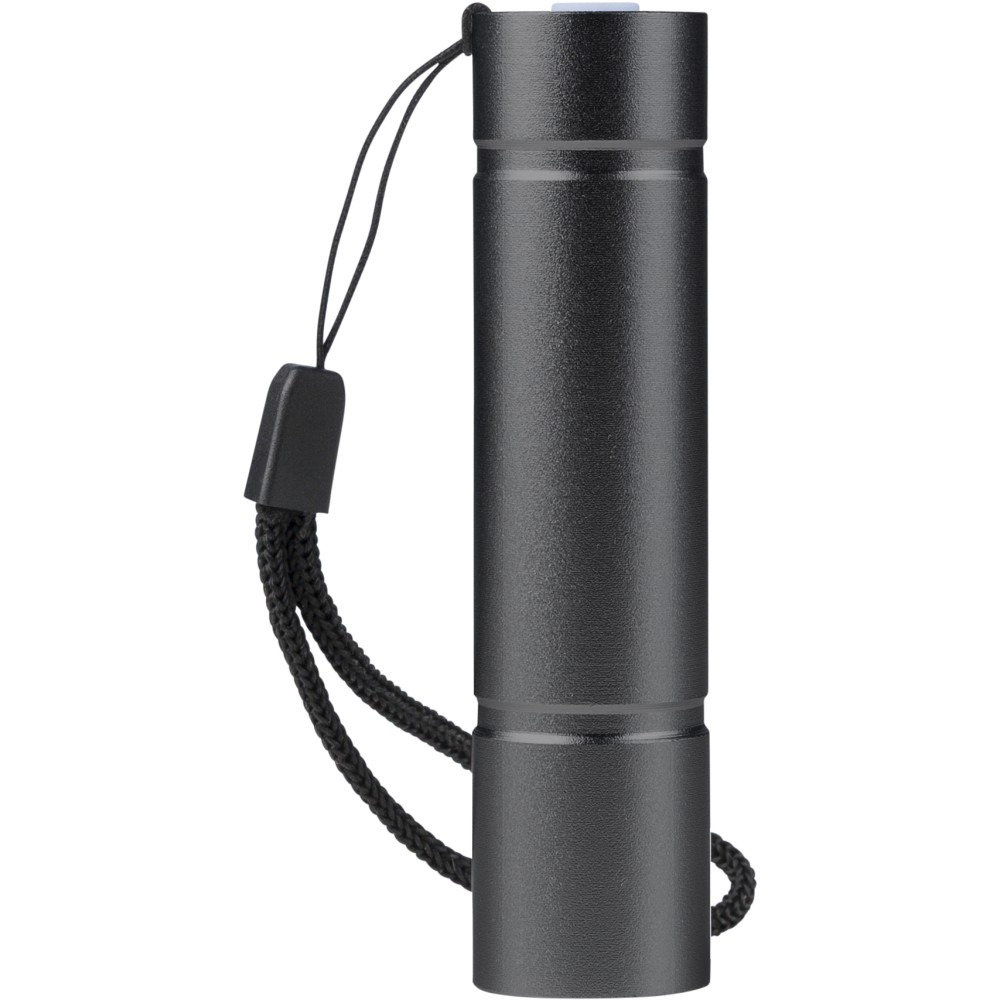 Recycled aluminium COB flashlight (80?100 lumen) with 3 light modes, push button, wrist cord, and engraved recycled logo. Rechargeable via USB-C (300 mAh), includes 30 cm cable. Packed in brown box with illustration.