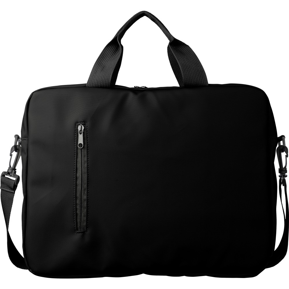 PU laptop bag (15 inch) with two zippered front pockets, a large zippered compartment with a Velcro-closed laptop section, and multiple inserts inside. Includes adjustable carrying straps and two handles. Water repellent.