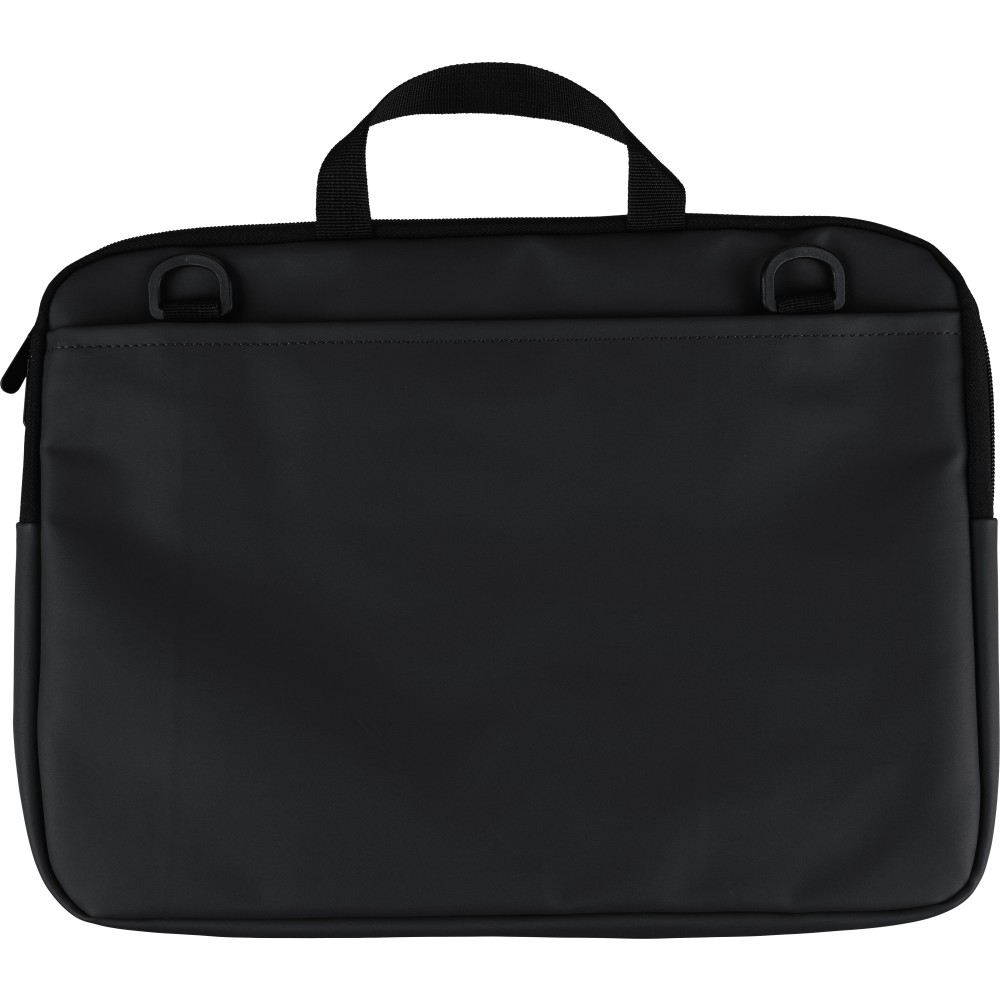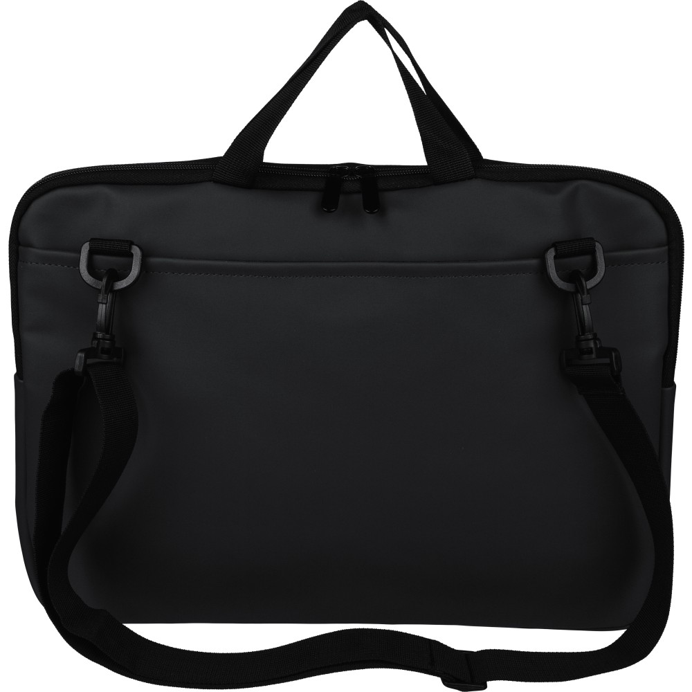 Recycled PU laptop bag for devices up to 15?, with 4 mm padding and 210D recycled lining. Features front zip pocket, back pocket with velcro, two short handles, adjustable shoulder strap, and small recycled logo in the inside label.