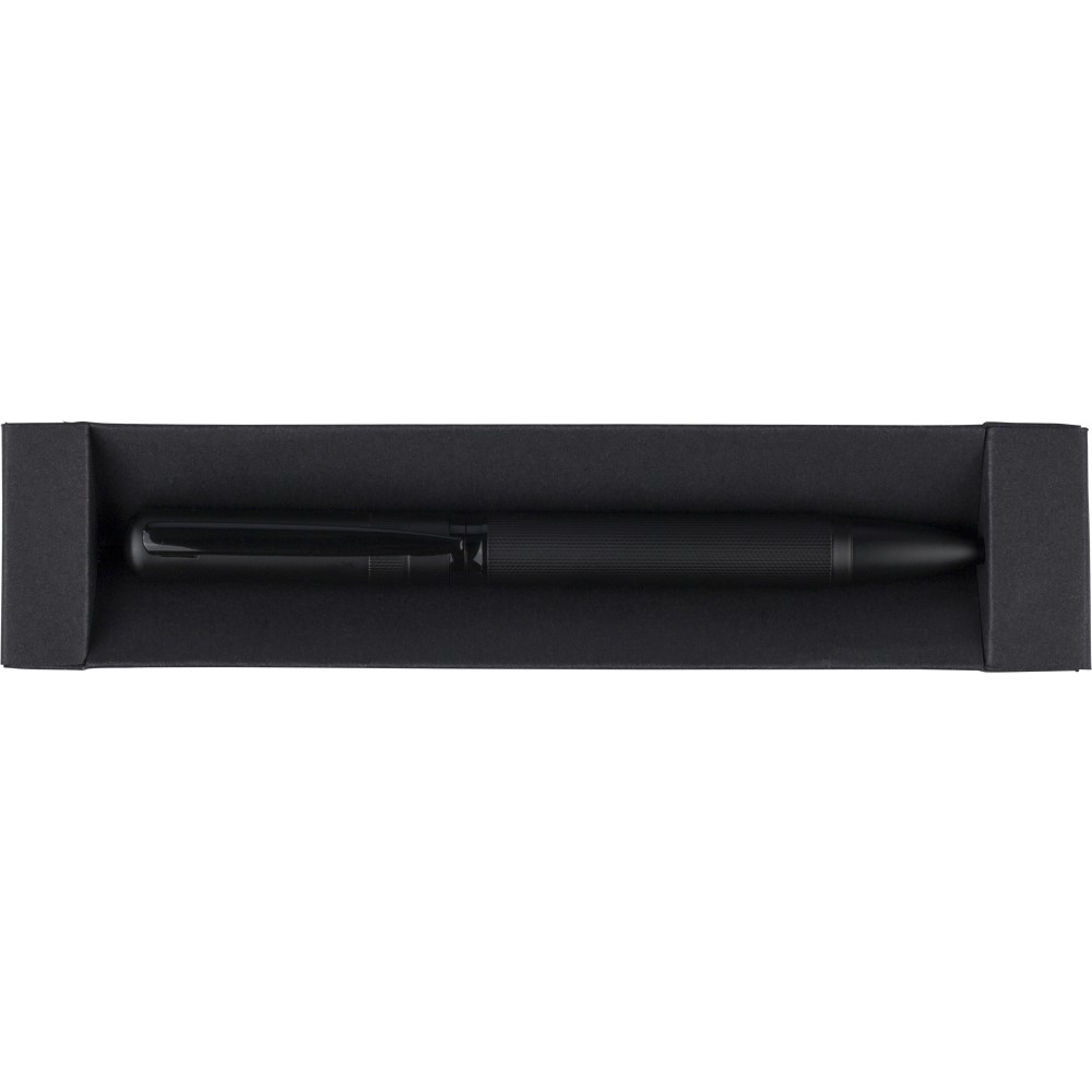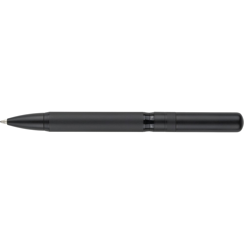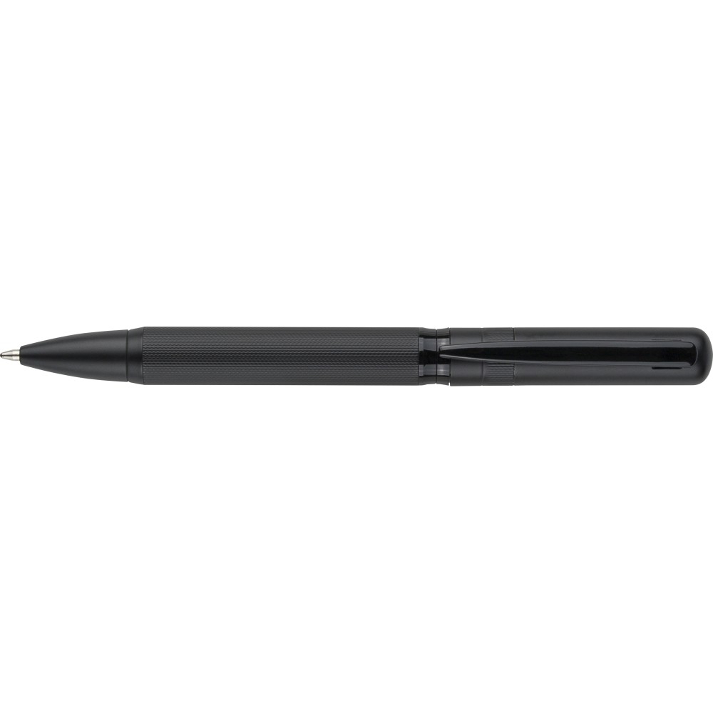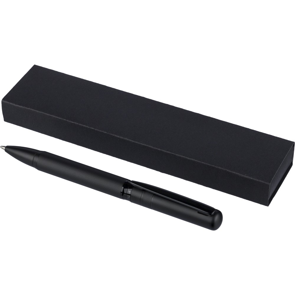 Ecobrass twist ballpen with color-matching metal clip and turn mechanism. Fitted with German Dokumental ink in blue writing and an approximate writing length of 1,000 meters. Individually packaged in a black sliding box. Blue ink.