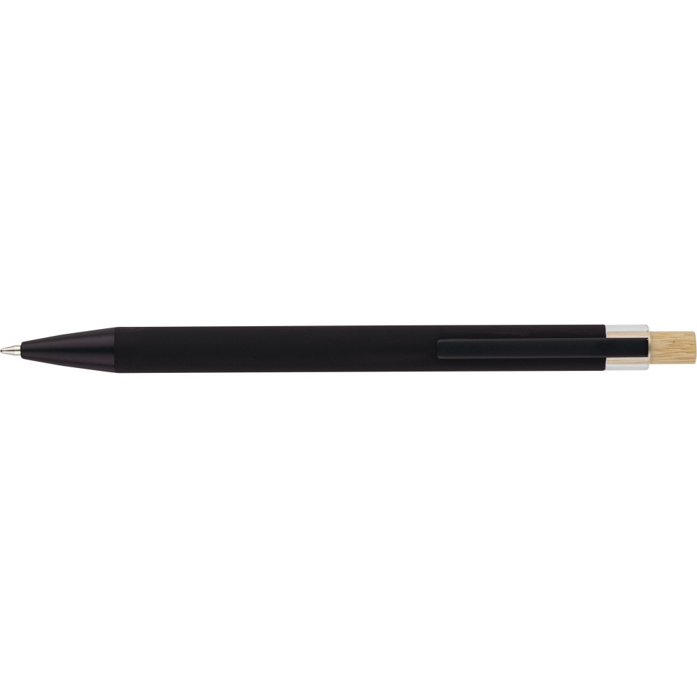 Recycled aluminium ballpen with bamboo push button featuring an AS plastic detail. Includes a metal clip and plastic tip, both in matching colors. Laser-engraved recycled logo on the barrel. Approximate writing length of 800 metres. Blue ink.