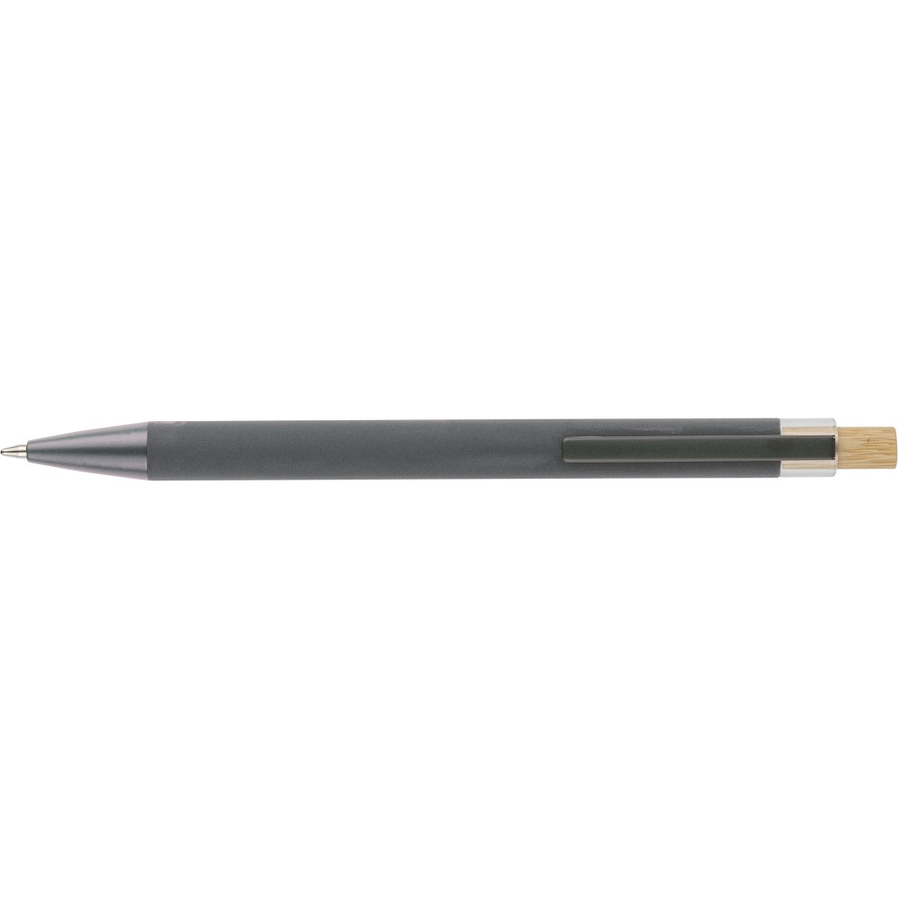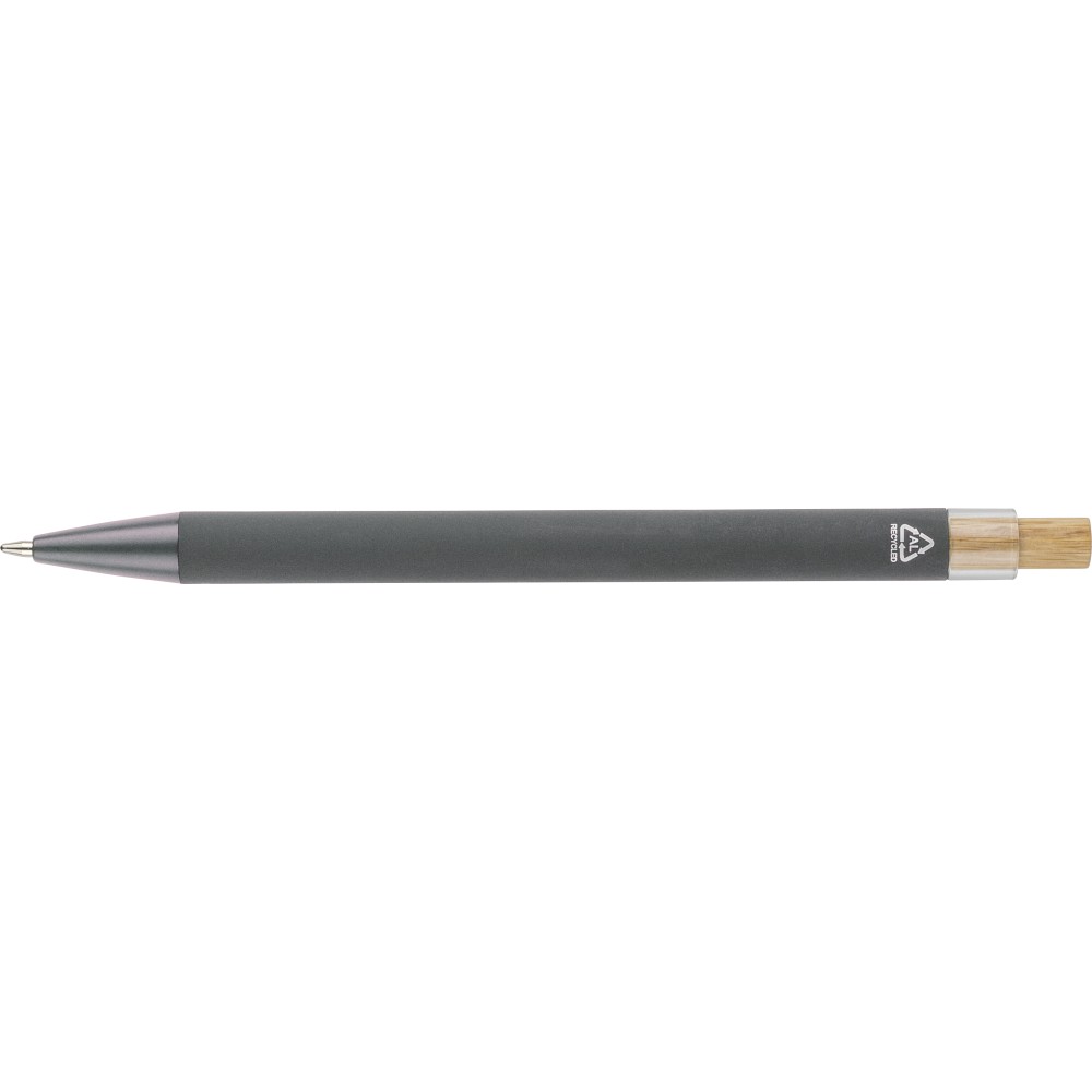 Recycled aluminium ballpen with bamboo push button featuring an AS plastic detail. Includes a metal clip and plastic tip, both in matching colors. Laser-engraved recycled logo on the barrel. Approximate writing length of 800 metres. Blue ink.