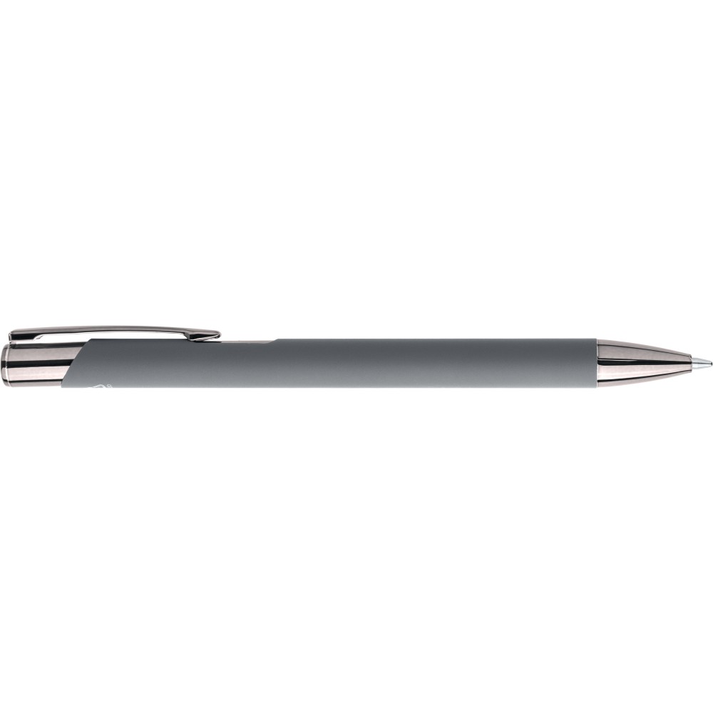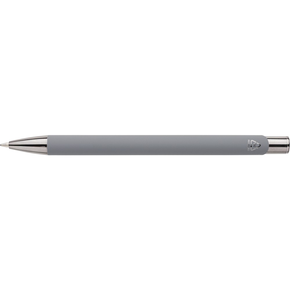 Recycled aluminium rubberized ballpen with matching UV-coated plastic and metal details. Shiny mirror effect appears after engraving. Features engraved recycled logo and writes approx. 800 metres. Blue ink.