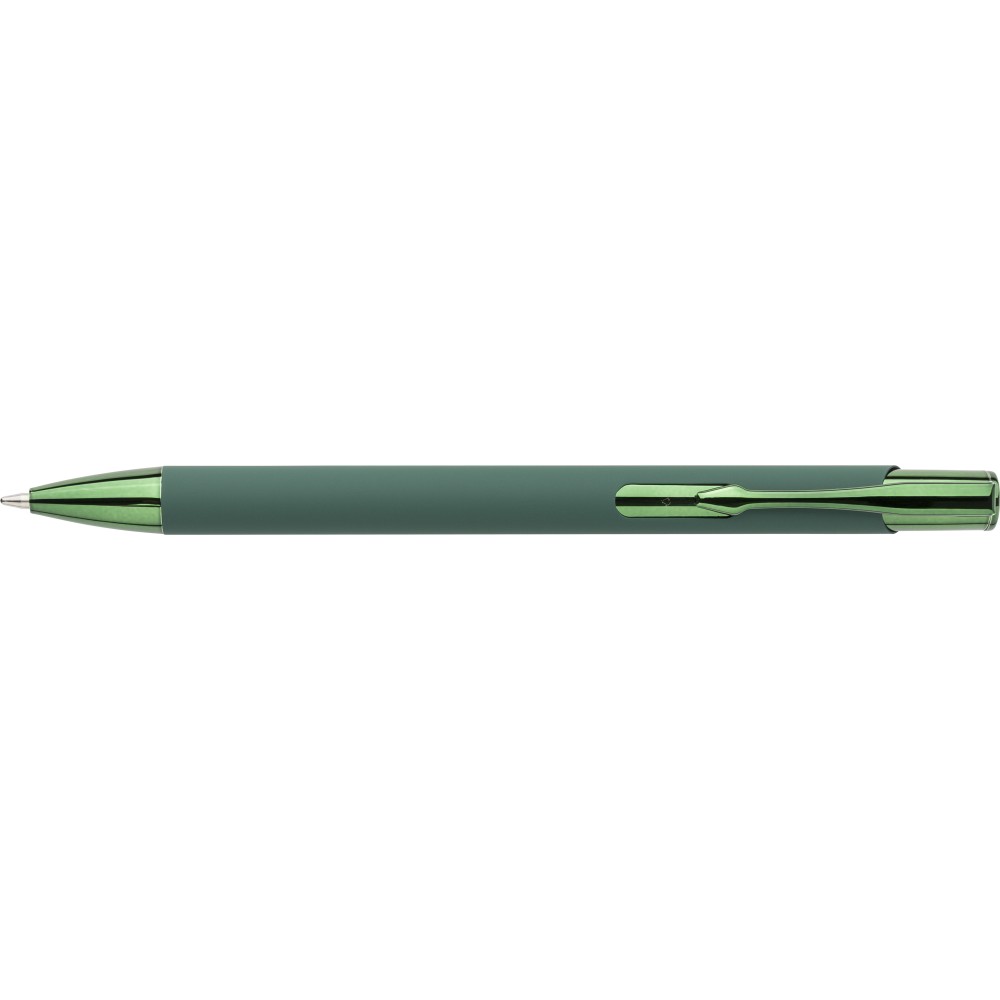 Recycled aluminium rubberized ballpen with matching UV-coated plastic and metal details. Shiny mirror effect appears after engraving. Features engraved recycled logo and writes approx. 800 metres. Blue ink.