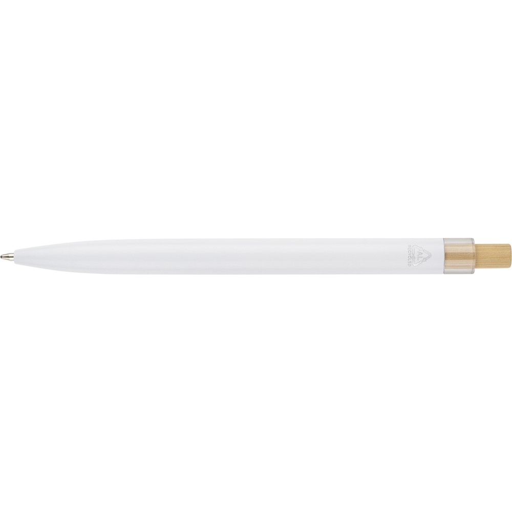 Recycled aluminium lacquered push ballpen with bamboo pusher, rPET trim, and metal clip. Features an engraved recycled logo. Approximate writing length of 700 metres. Blue ink.