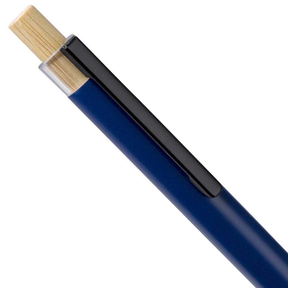 Recycled aluminium lacquered push ballpen with bamboo pusher, rPET trim, and metal clip. Features an engraved recycled logo. Approximate writing length of 700 metres. Blue ink.