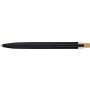Recycled aluminium lacquered pen set with ballpen and roller pen. Features bamboo pusher, rPET trim, and metal clip; roller pen includes bamboo/rPET cap detail and matching clip. Both with engraved recycled logo. Writes approx. 700 m (ballpen) and 500 m (roller pen). Blue ink. Packed in colored recycled cardboard gift box.