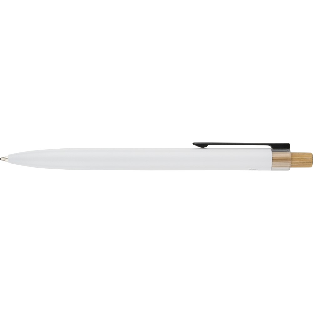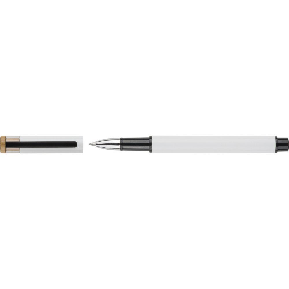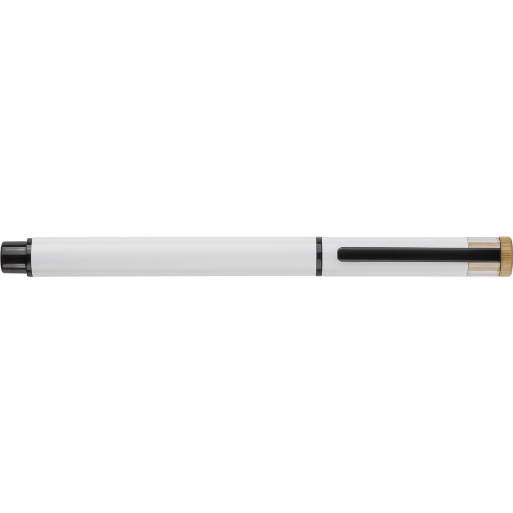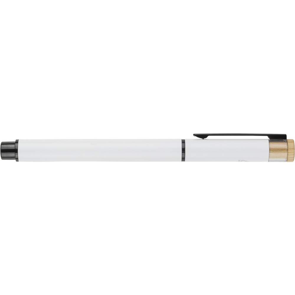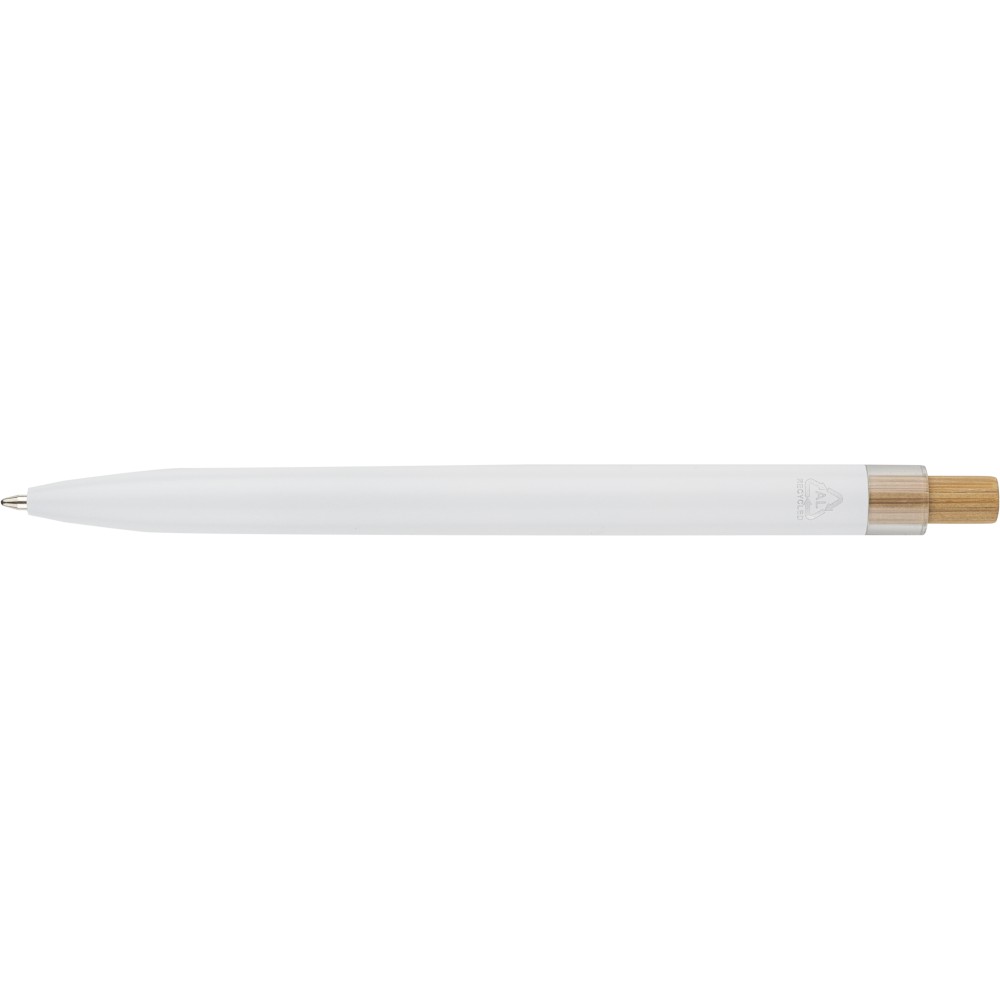 Recycled aluminium lacquered pen set with ballpen and roller pen. Features bamboo pusher, rPET trim, and metal clip; roller pen includes bamboo/rPET cap detail and matching clip. Both with engraved recycled logo. Writes approx. 700 m (ballpen) and 500 m (roller pen). Blue ink. Packed in colored recycled cardboard gift box.