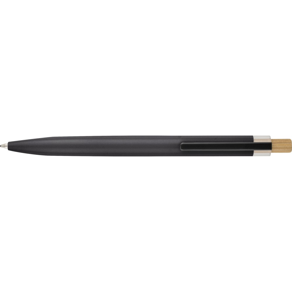 Recycled aluminium lacquered pen set with ballpen and roller pen. Features bamboo pusher, rPET trim, and metal clip; roller pen includes bamboo/rPET cap detail and matching clip. Both with engraved recycled logo. Writes approx. 700 m (ballpen) and 500 m (roller pen). Blue ink. Packed in colored recycled cardboard gift box.