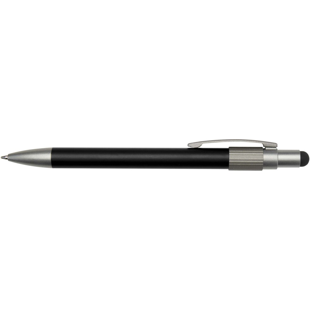 Ballpoint pen with stylus and fidget spinner, combining practicality with a playful design. The pen is made from RCS certified recycled aluminium and features a smooth push mechanism and a stylus tip for touchscreen use. A built-in fidget spinner on top adds a stress-relieving touch (just flick to activate). Pen ink colour: black. Writing length: 1000 metres.