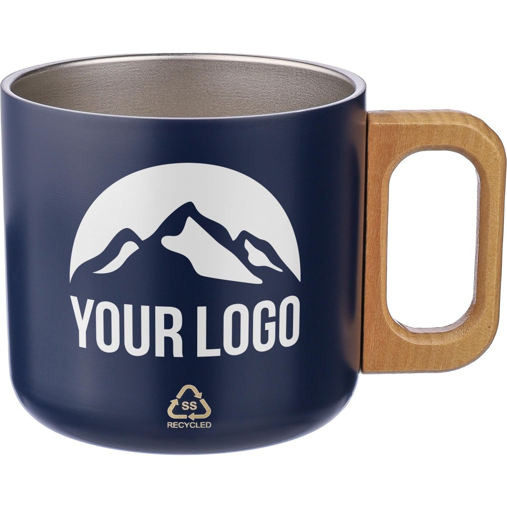 Recycled stainless steel double-walled mug (400 ml) with wooden handle. Not dishwasher safe. Includes an engraved recycled stainless steel logo. Individually packaged in a brown cardboard box.