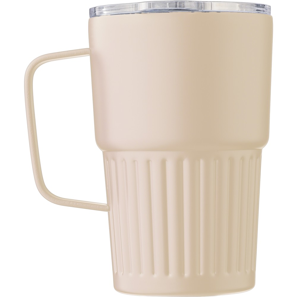 Recycled stainless steel double-walled drinking mug (450 ml). The interior is made of stainless steel 304 and the exterior is stainless steel 201 with a ridge grip and sturdy handle. Features an AS lid with a slide closure. Includes an engraved recycled logo on the body. Individually packaged in a brown cardboard box.