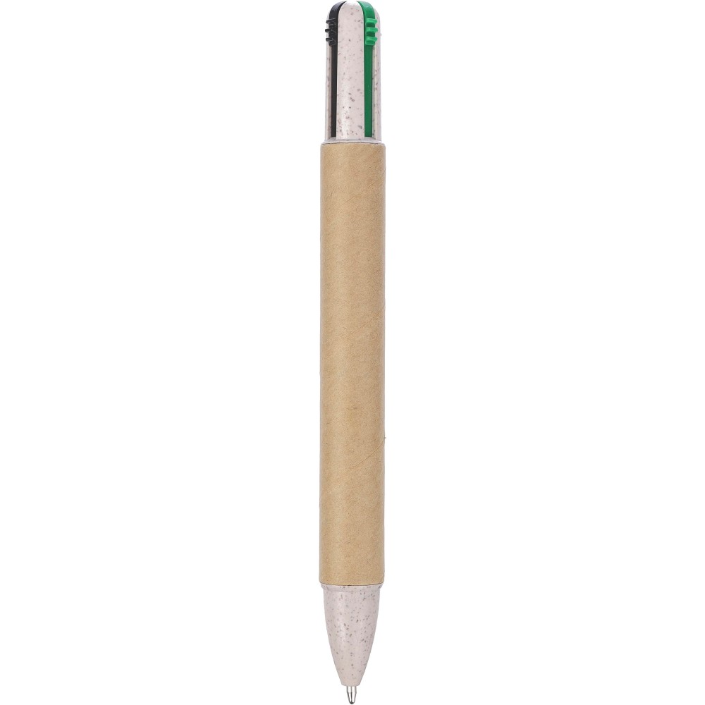 Recycled carton and wheat straw four-color ballpoint pen. Approx. 300 meters of writing length per color. Ink refill colors: blue, black, red, and green.