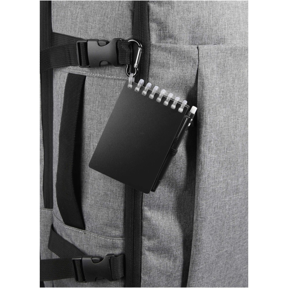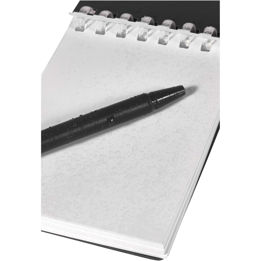 The Lig Mini notebook and pen set is a compact and practical companion for on-the-go note-taking. The spiral-bound notebook has a soft recycled plastic cover and 70 blank sheets of 120 g/m2 water-resistant stone paper, making it ideal for outdoor use. With rounded corners and a built-in pen loop, it embraces the mini-size trend while remaining functional. The matching ballpoint pen is made from recycled ABS plastic, writes in black ink, and offers a writing length of 250 metres. A colour-coordinated metal ring allows the set to be easily attached to a backpack, purse, or keychain, making it perfect for durable and portable note-taking. Notebook size: 11 × 7.5 cm.