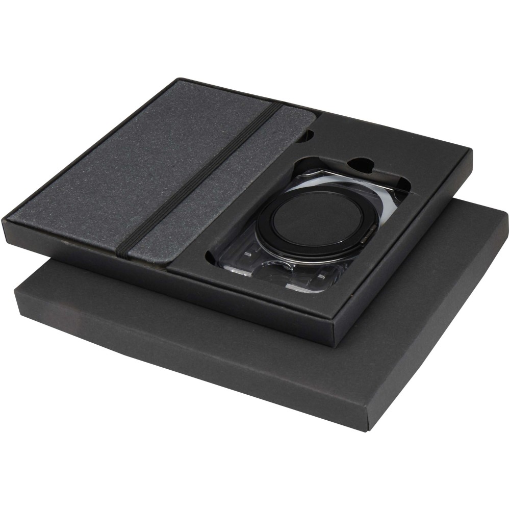 A practical gift set featuring an A6 notebook and MagSafe wallet. The notebook has a dark grey recycled plastic cover, 80 lined cream-coloured sheets of 70 g/m2 paper, and a black elastic closure. The transparent MagSafe wallet holds one card and attaches magnetically to iPhone 12 or newer models, and also comes with an extra metal ring for use with other phones. Both items are presented in a sleek black cardboard gift box.